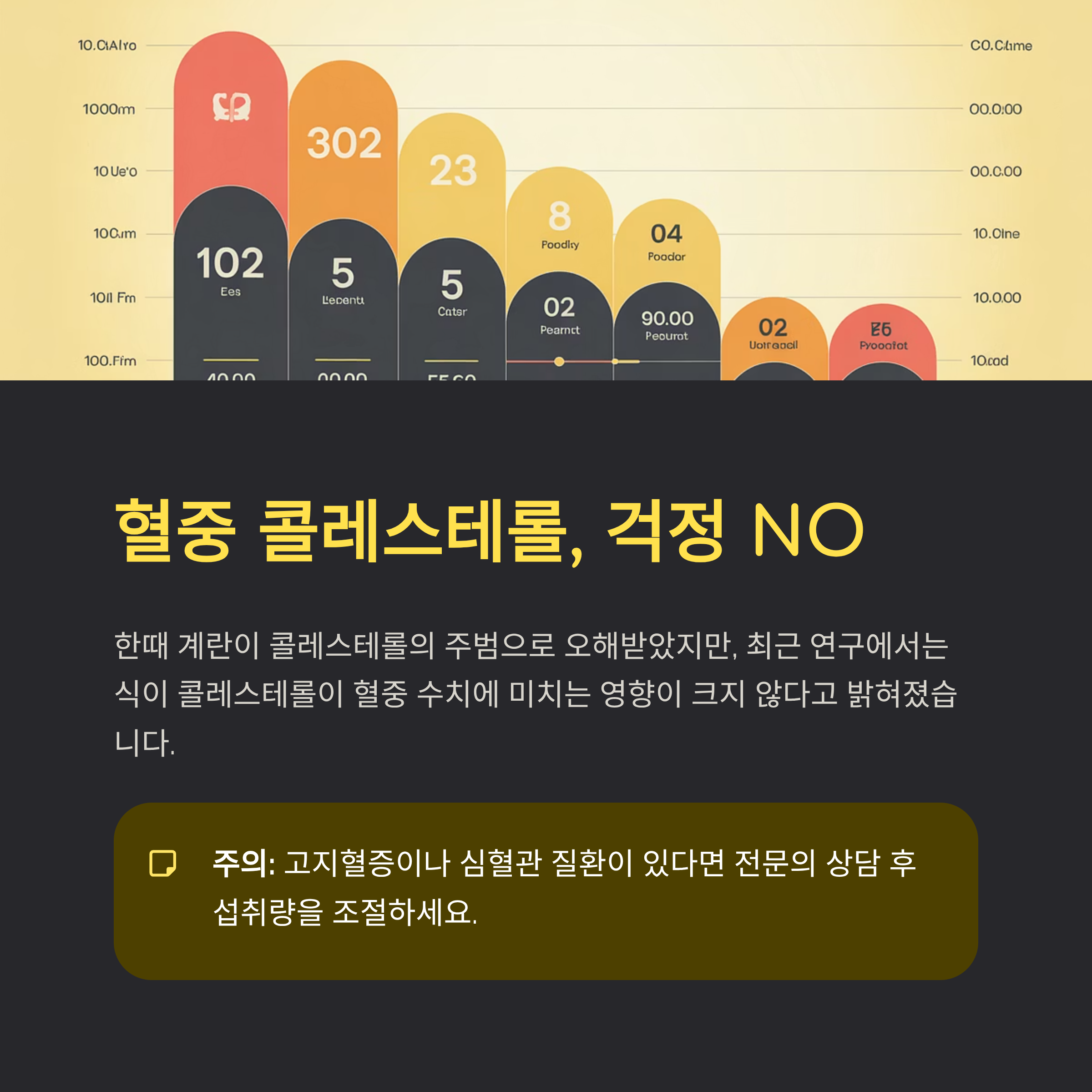 한때 계란이 콜레스테롤의 주범처럼 오해받기도 했지만, 최근에는 식이 콜레스테롤이 혈중 수치에 미치는 영향이 크지 않다는 연구가 많습니다.