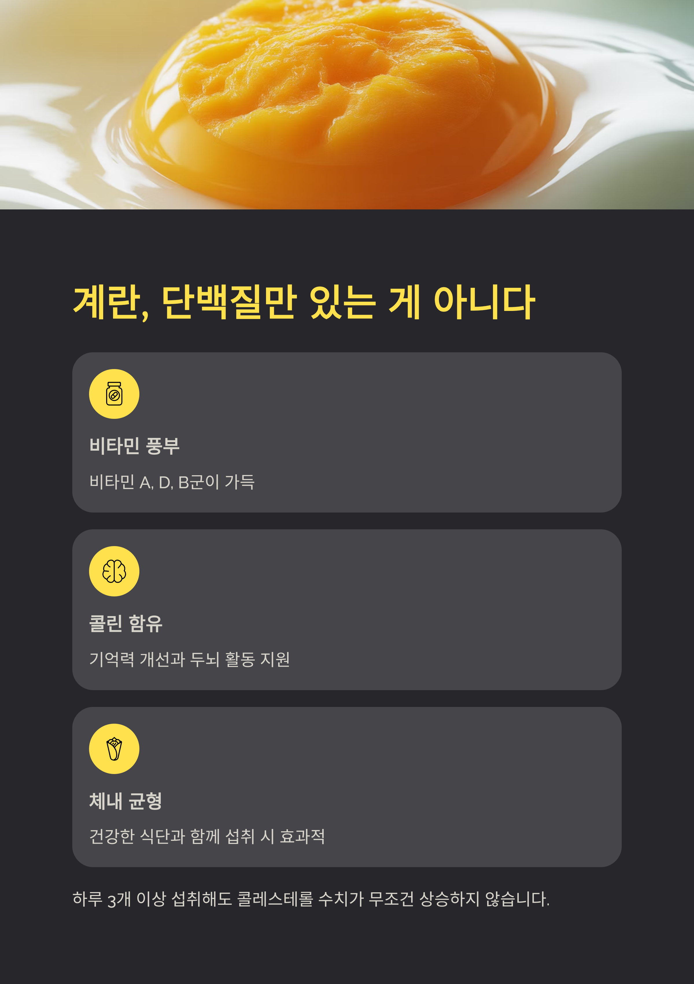 계란은 고단백 식품이라는 점 외에도 비타민 A, D, B군, 콜린, 레시틴 등 몸에 좋은 성분이 가득한 식재료입니다. 특히 계란 노른자에는 기억력 개선과 두뇌 활동에 중요한 콜린이 풍부해 뇌 건강에도 긍정적이에요.