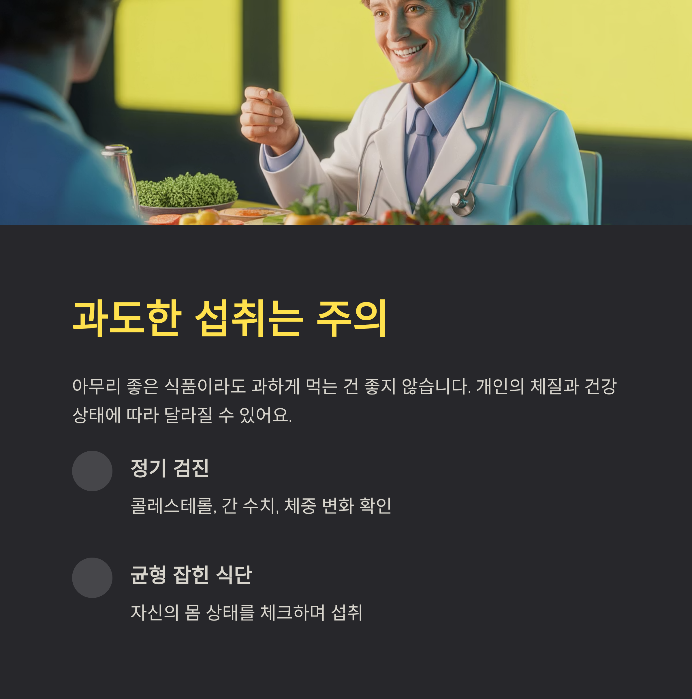 단, 고지혈증이나 심혈관 질환을 앓고 있는 사람이라면 무조건적인 섭취보다는 전문의 상담 후 섭취량을 조절하는 것이 좋아요.