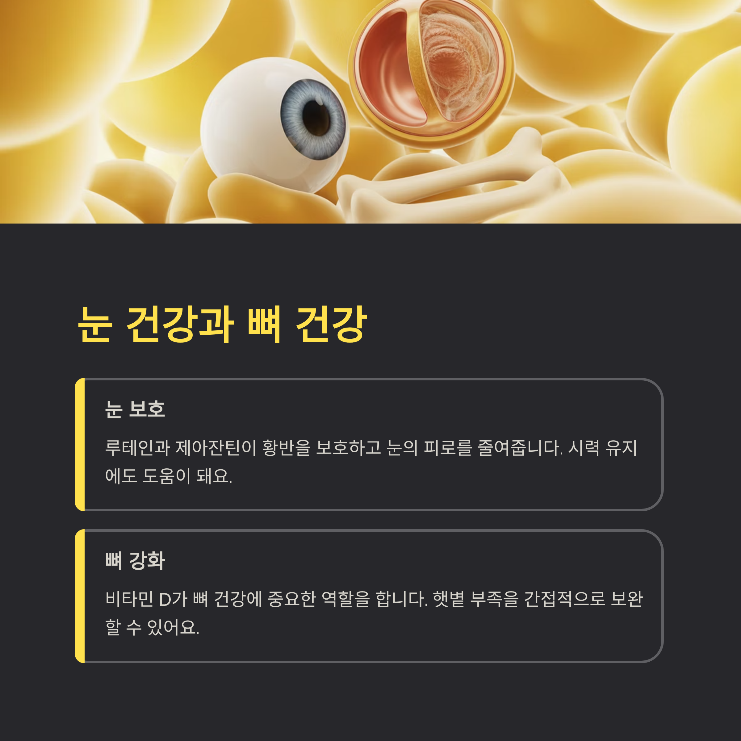 계란 노른자에 들어 있는 루테인과 제아잔틴은 황반을 보호하는 역할을 하며, 눈의 피로를 줄이고 시력을 유지하는 데 도움을 줄 수 있습니다.