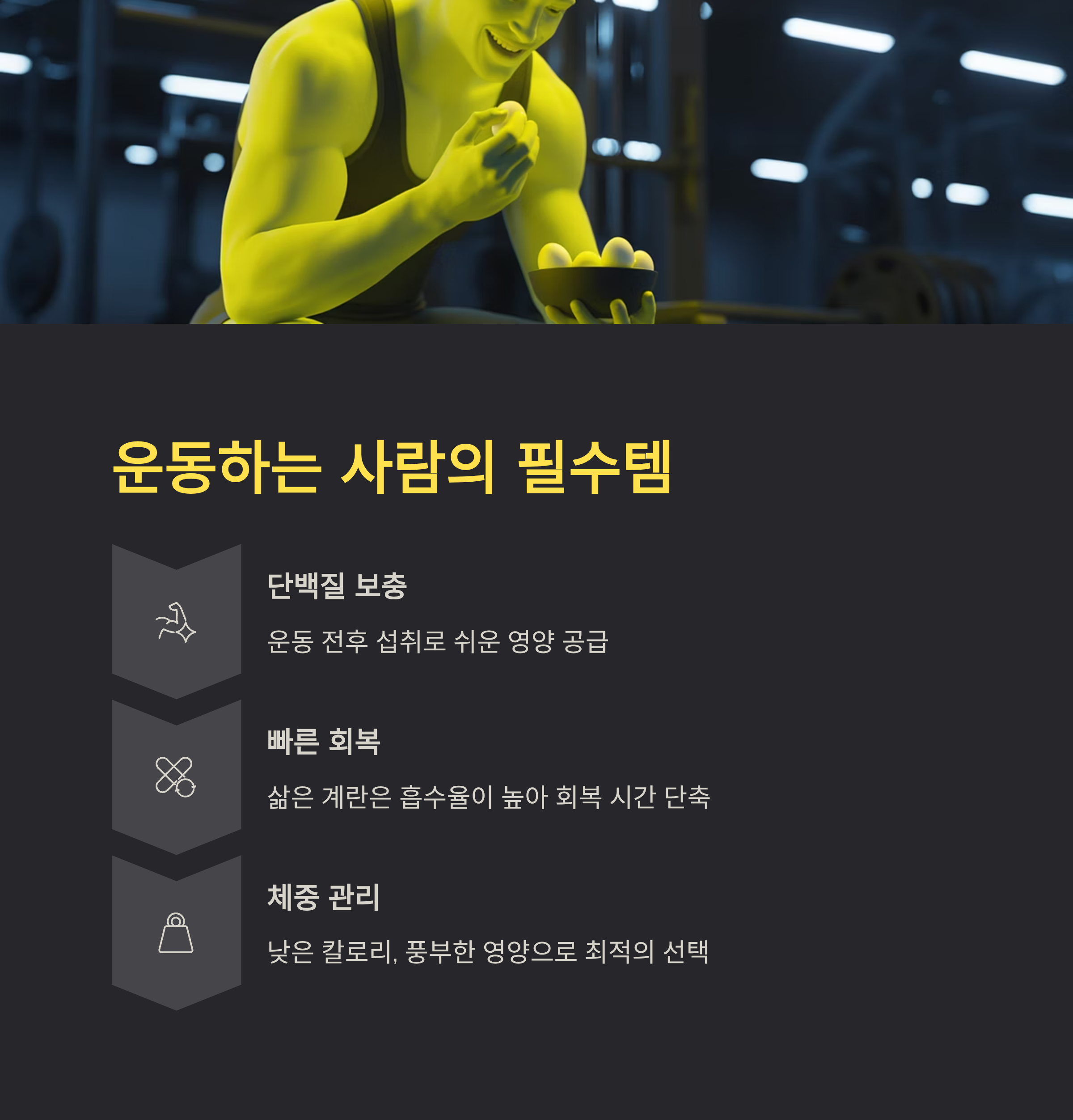 운동 전후에 계란을 섭취하면 단백질 보충이 쉬우며, 회복 시간도 단축될 수 있습니다. 특히 삶은 계란은 조리법도 간단하고 흡수율이 높기 때문에 헬스인들 사이에서는 필수템으로 자리 잡았죠.