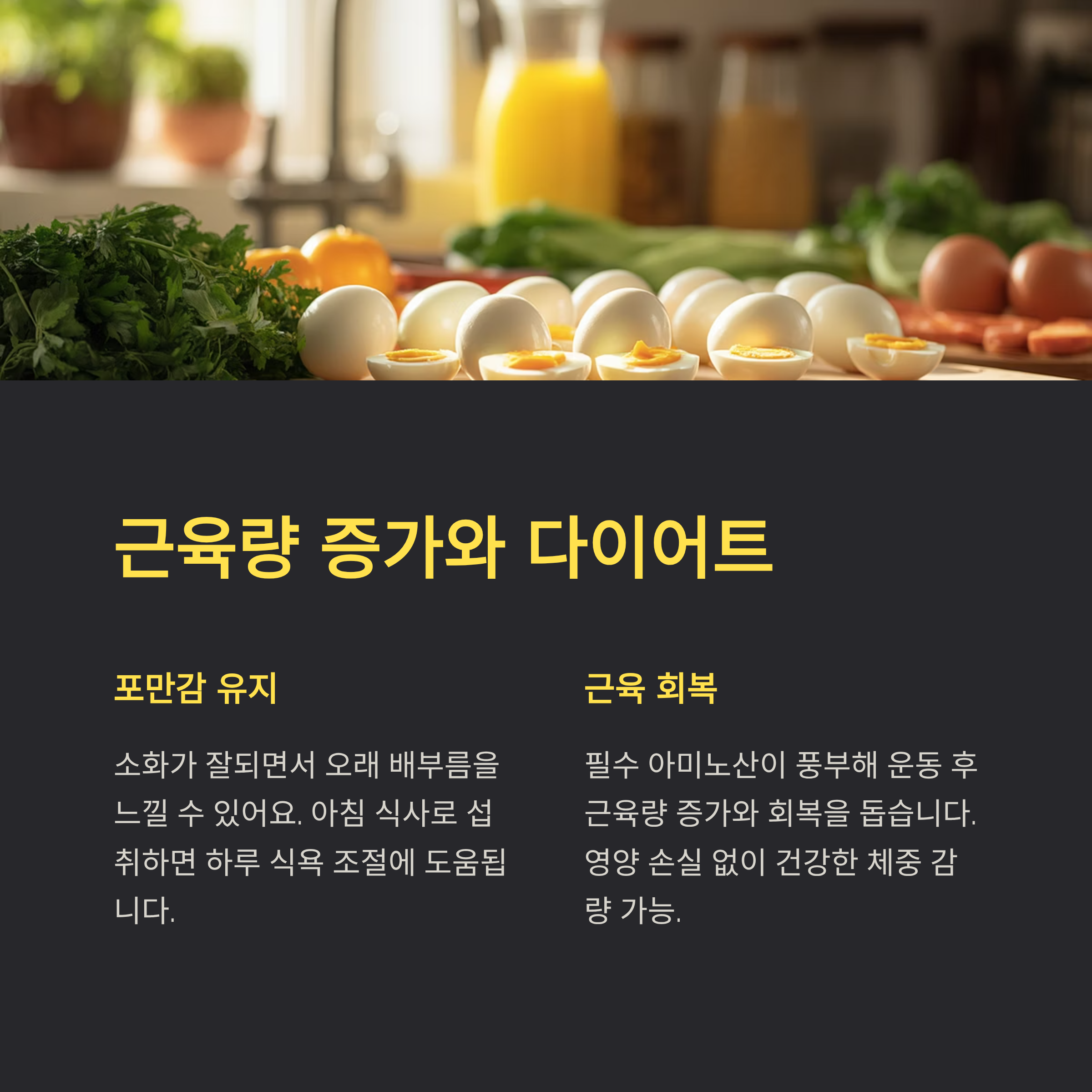 운동을 병행하는 사람이라면 근육량 증가나 회복에도 도움을 줄 수 있는데, 이는 계란에 함유된 필수 아미노산 덕분입니다. 다이어트를 하면서도 영양 손실 없이 건강하게 체중 감량이 가능하죠.