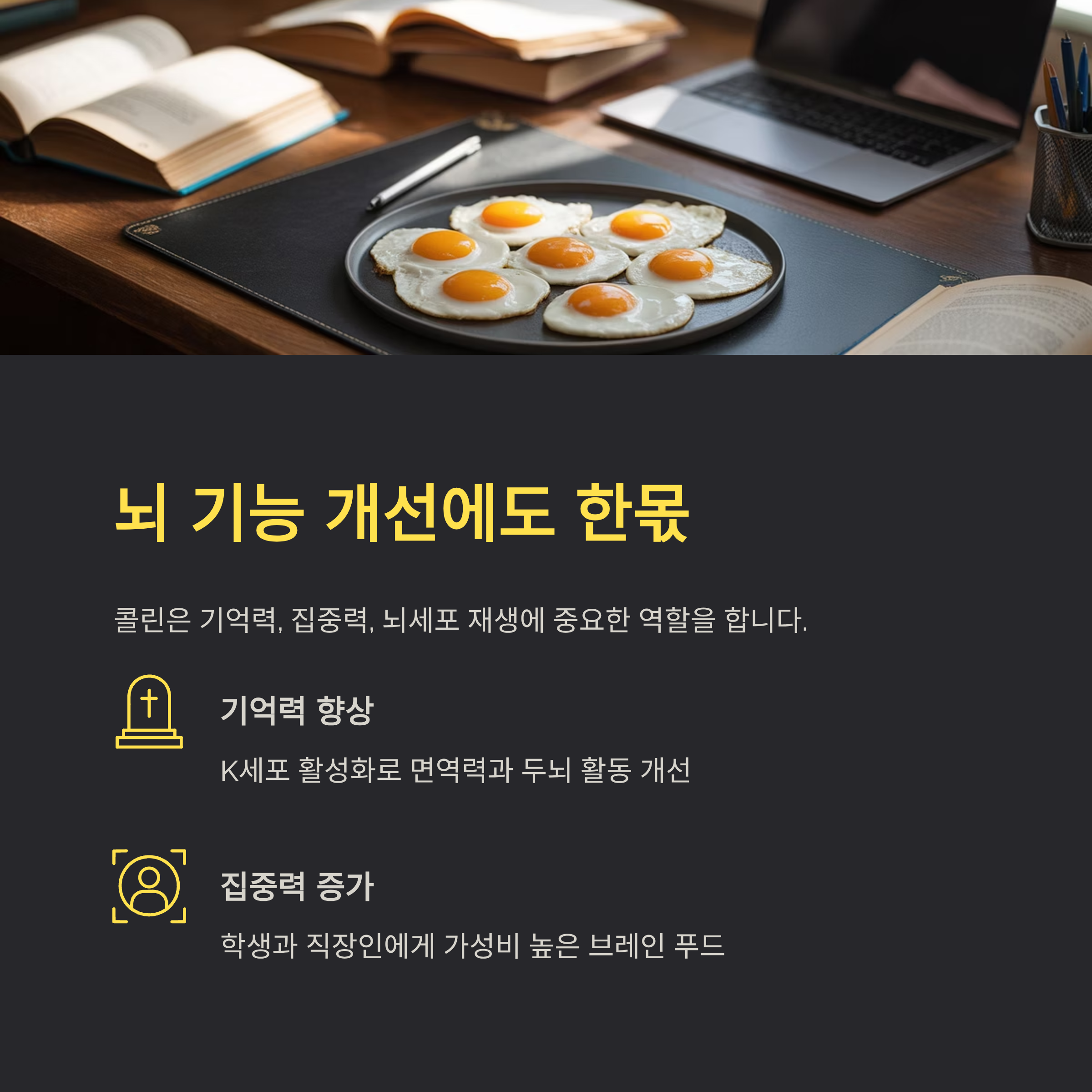 콜린은 기억력, 집중력, 뇌세포 재생 등에 중요한 역할을 합니다. 계란을 꾸준히 섭취하면 K세포 활성화가 증가해 면역력 향상뿐 아니라 두뇌 활동 개선에도 기여할 수 있어요.