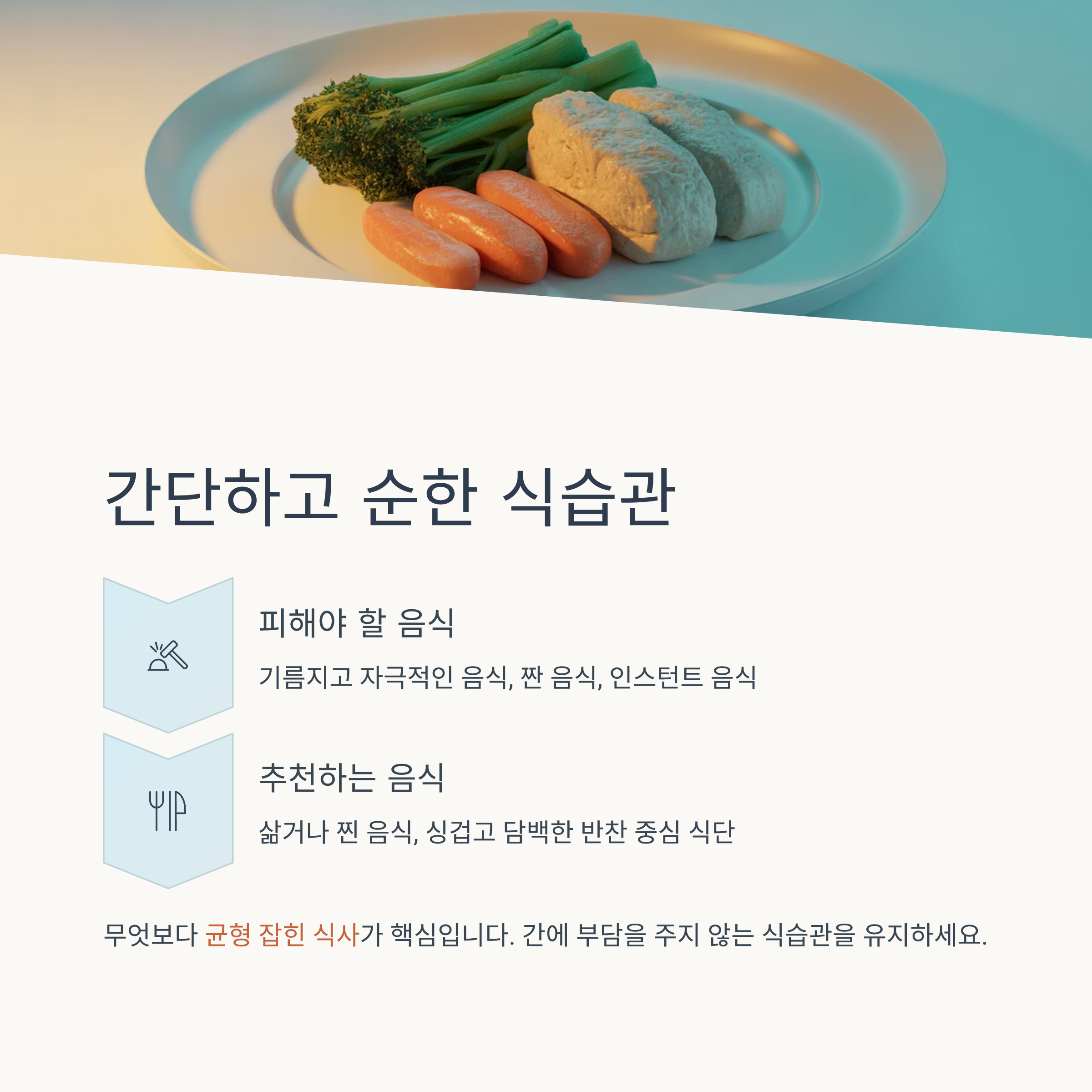 기름지고 자극적인 음식은 간에 부담을 줄 수 있으니 가능한 한 줄이는 것이 좋아요.