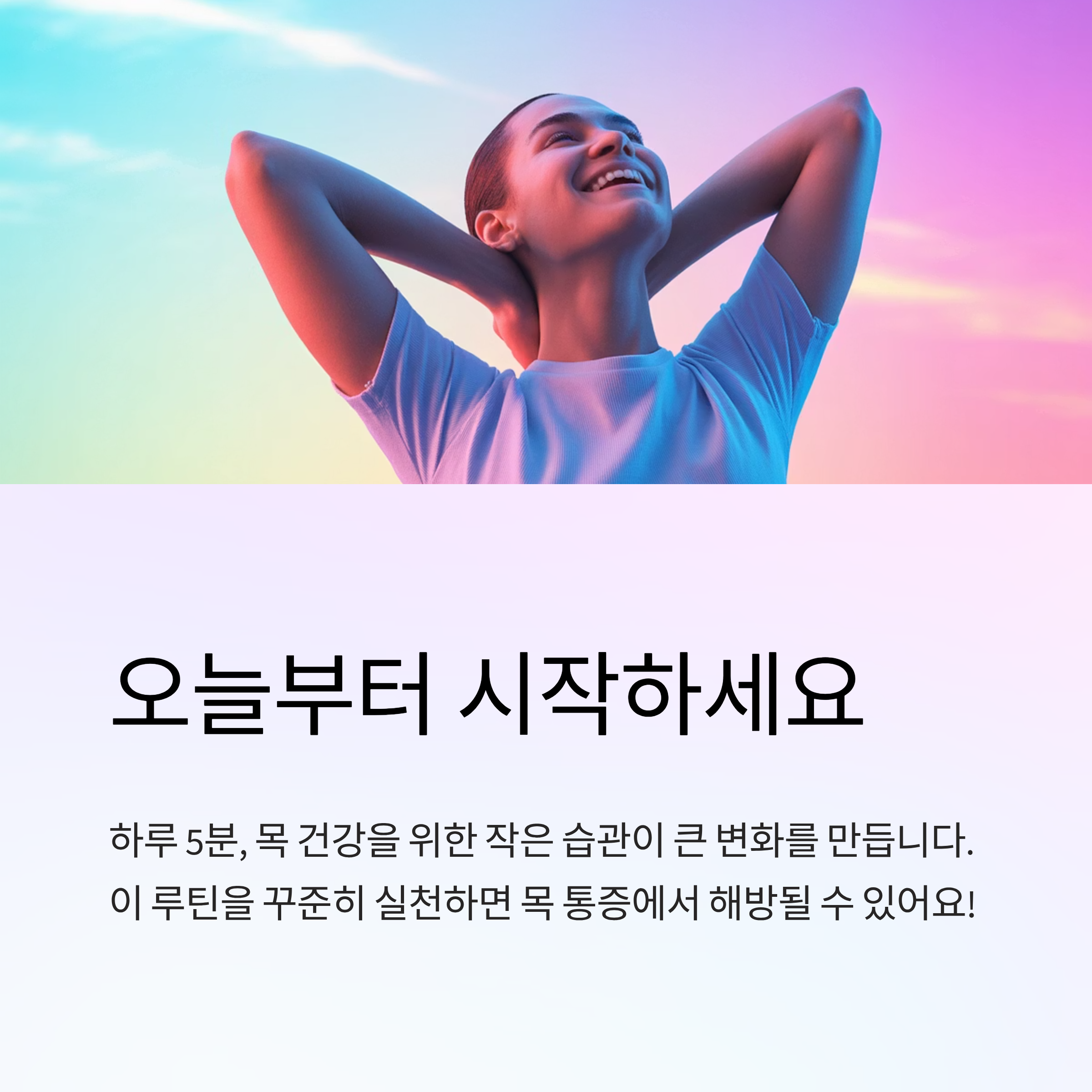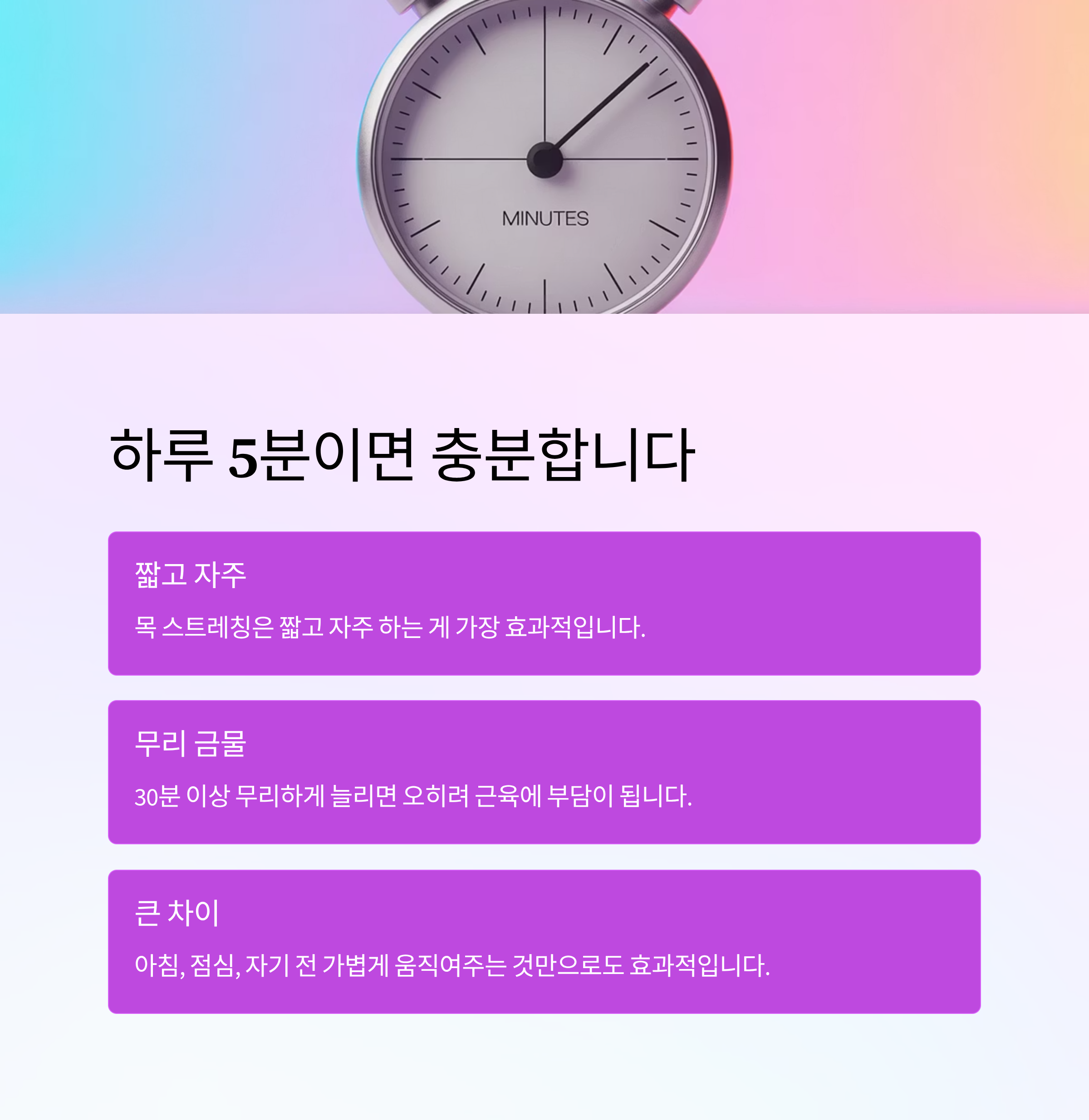 목 스트레칭은 짧고 자주 하는 게 효과적입니다. 오히려 30분 이상 무리하게 늘리면 근육에 부담이 될 수 있어요. 하루 5분, 아침이나 자기 전 또는 점심시간 짬을 내어 가볍게 움직여주는 것만으로도 큰 차이가 납니다.