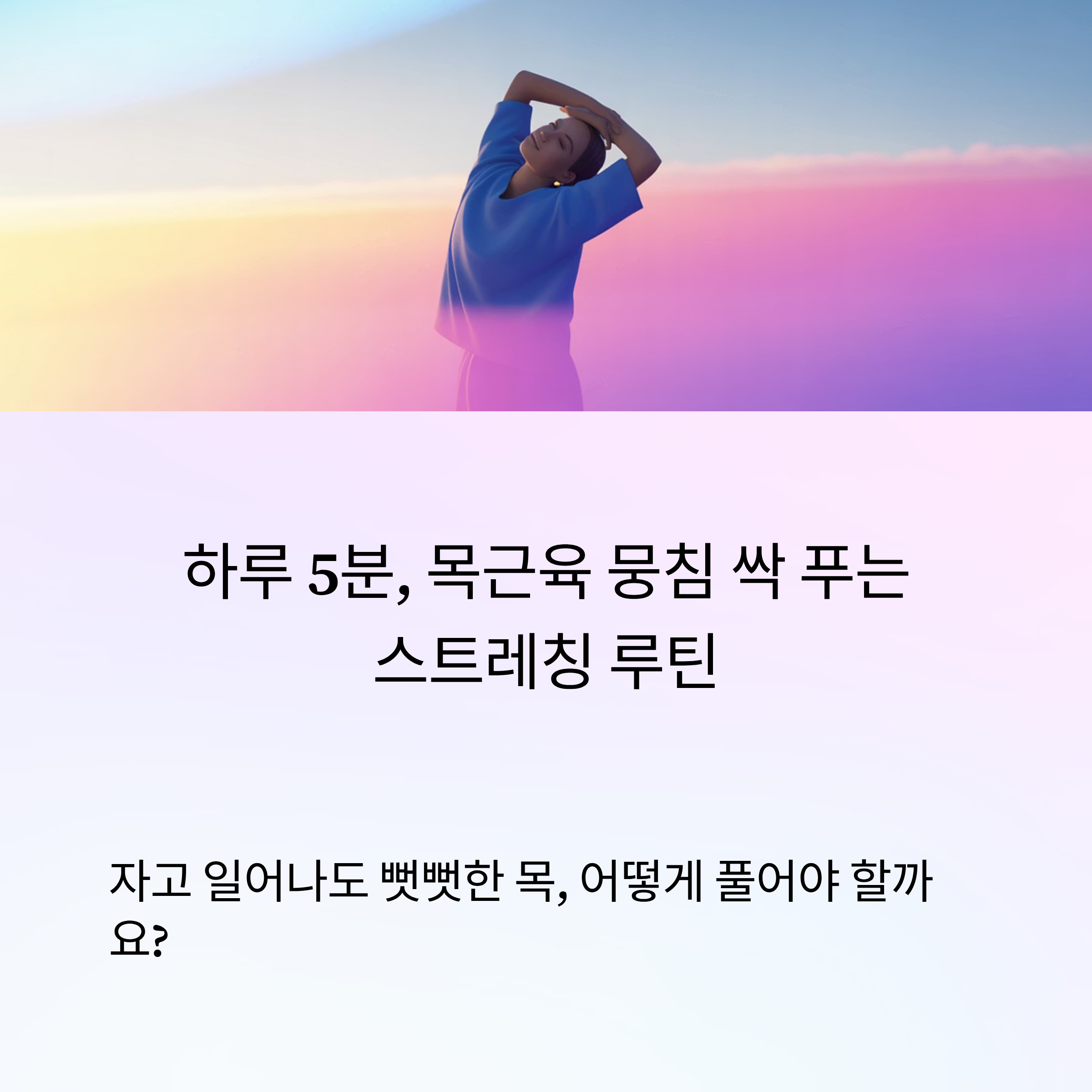 아침에 일어나면 목이 뻣뻣하고 무겁게 느껴지시나요? 하루 종일 컴퓨터 앞에 앉아 있다 보면 어느새 목이 굳어버리는 느낌, 다들 한 번쯤 겪어보셨을 거예요. 오늘은 딱 5분이면 충분한, 목근육 뭉침을 부드럽게 풀어주는 스트레칭 루틴을 소개합니다. 꾸준히 실천하시면 일상 속 목 통증이 훨씬 가벼워지는 걸 느끼실 수 있어요.