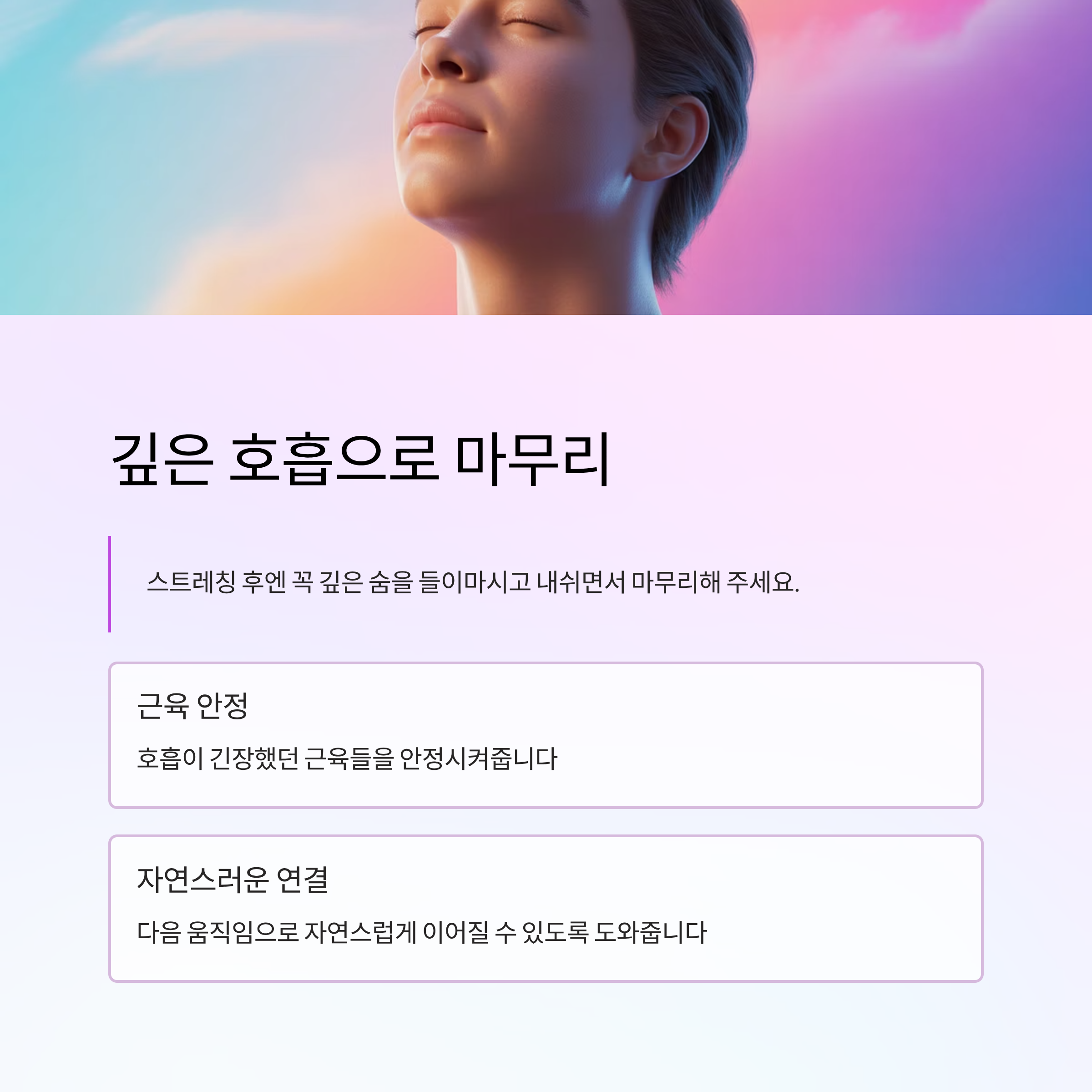 스트레칭 후엔 꼭 깊은 숨을 들이마시고 내쉬면서 마무리해 주세요. 이 호흡이 긴장했던 근육들을 안정시켜주고, 다음 움직임으로 자연스럽게 이어질 수 있도록 도와줍니다.
