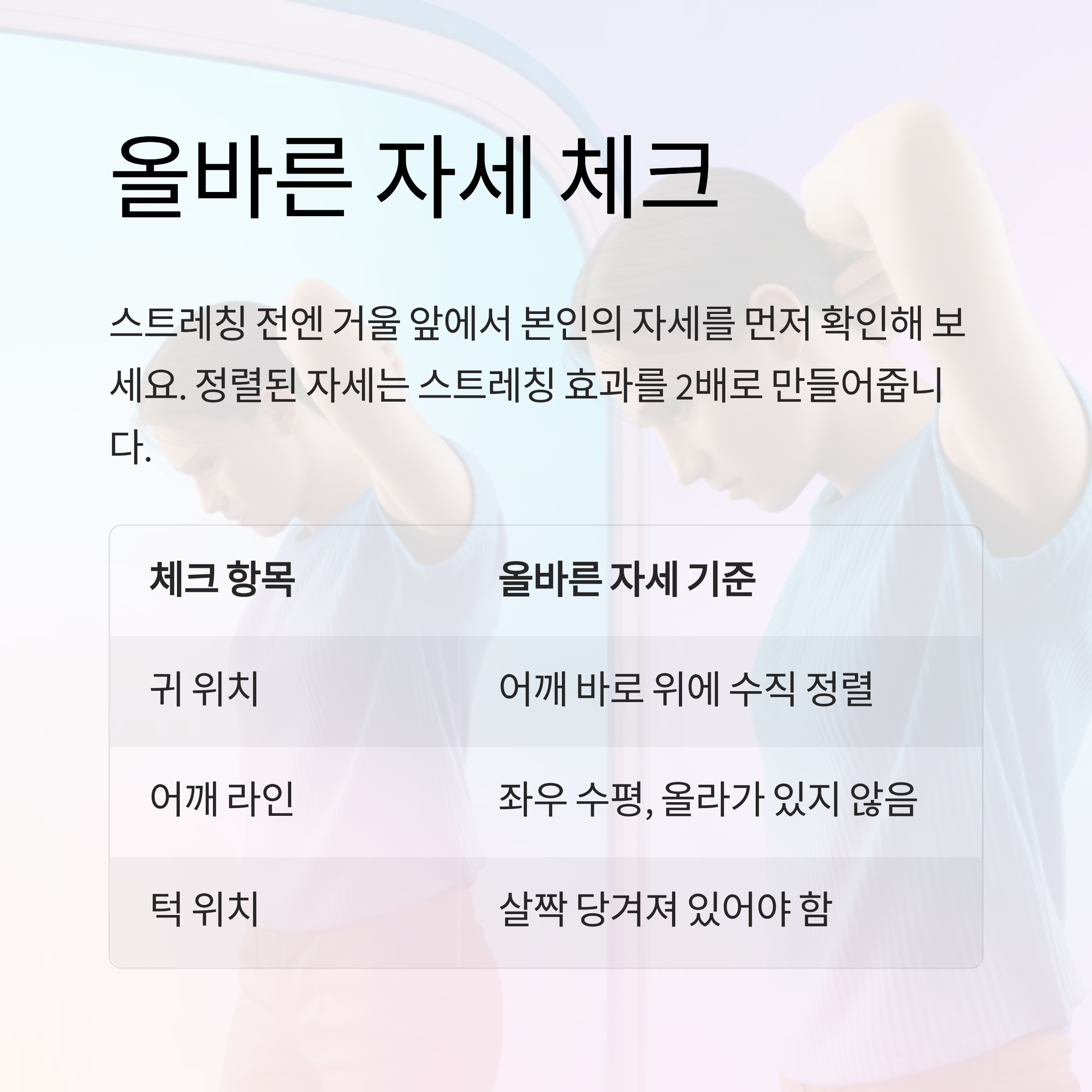스트레칭 전엔 거울 앞에서 본인의 자세를 먼저 확인해 보세요. 귀와 어깨가 일직선에 있나요? 턱은 앞으로 빠져 있진 않나요? 정렬된 자세는 스트레칭 효과를 2배로 만들어줍니다.