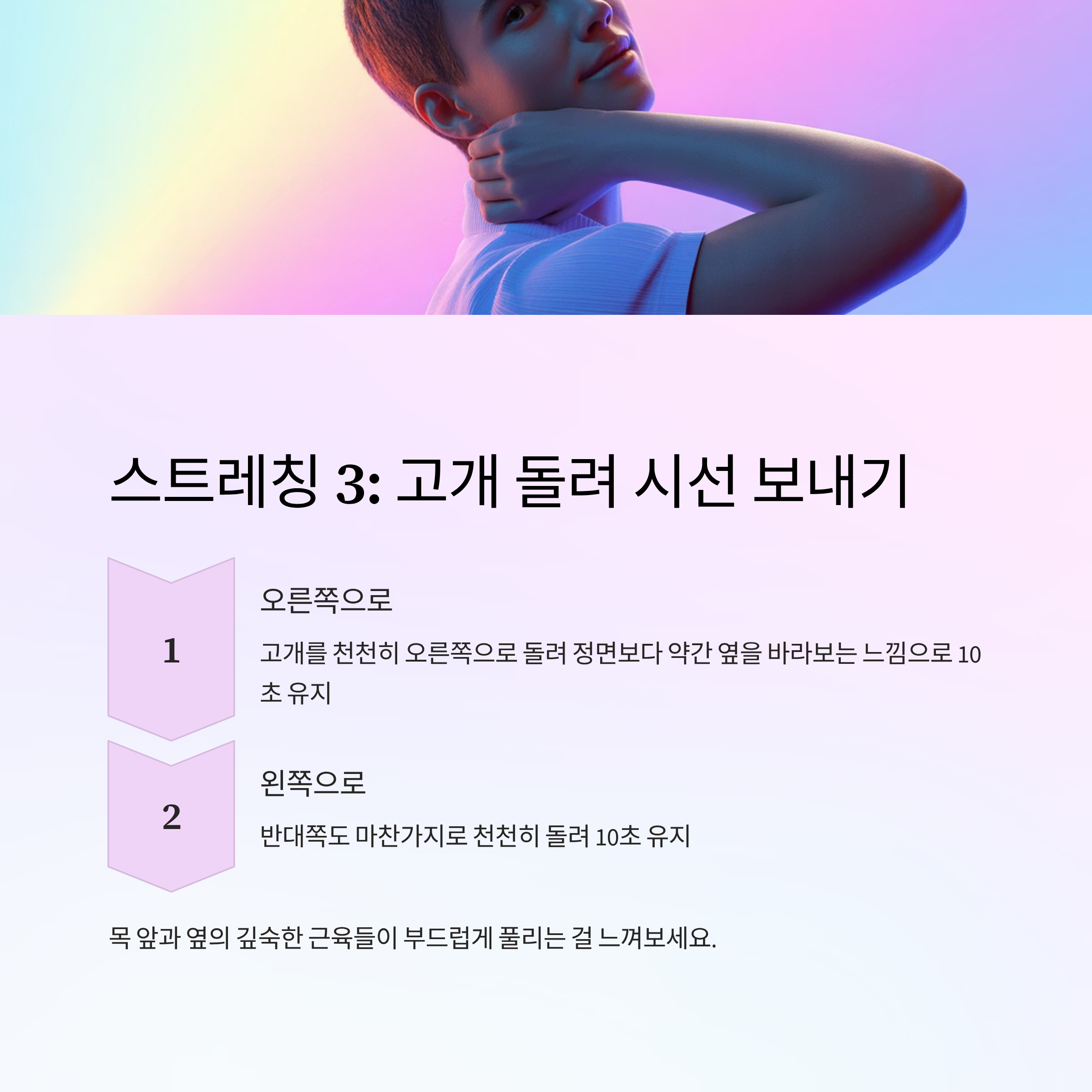 고개를 천천히 오른쪽으로 돌려 정면보다 약간 옆을 바라보는 느낌으로 10초 유지합니다. 반대쪽도 마찬가지. 목 앞과 옆의 깊숙한 근육들이 부드럽게 풀리는 걸 느껴보세요.