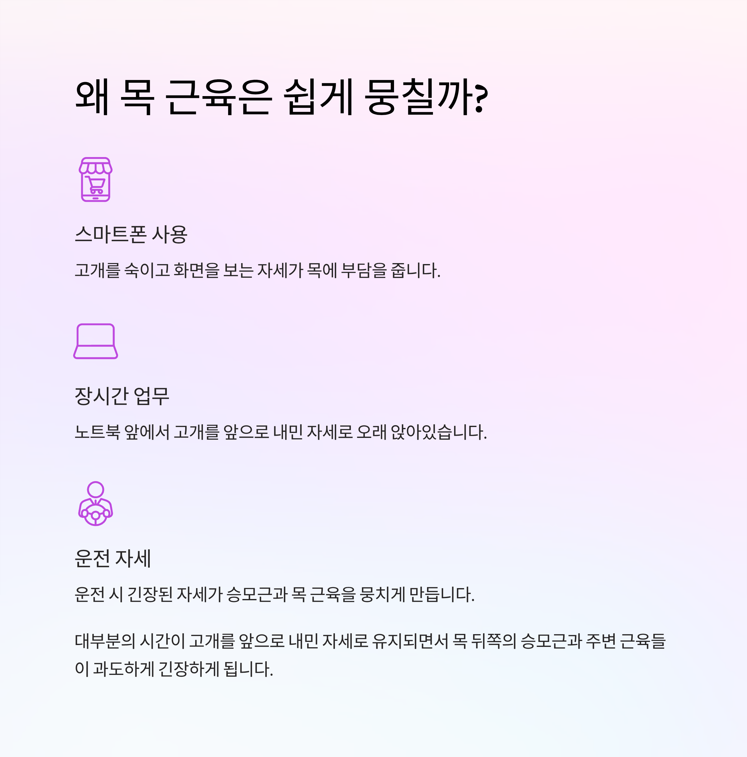 현대인의 목은 매일같이 긴장 상태입니다. 스마트폰을 볼 때, 노트북을 쓸 때, 운전을 할 때… 대부분의 시간이 고개를 앞으로 내민 자세로 유지되기 때문이죠. 이때 목 뒤쪽의 승모근과 주변 근육들이 과도하게 긴장하면서 뭉치게 됩니다.