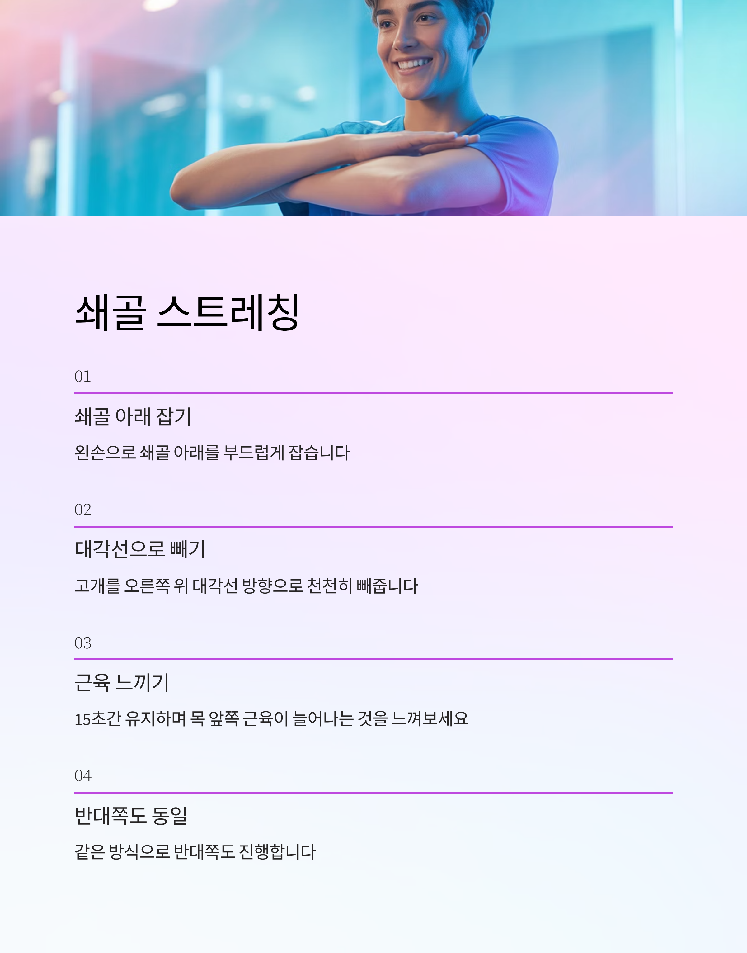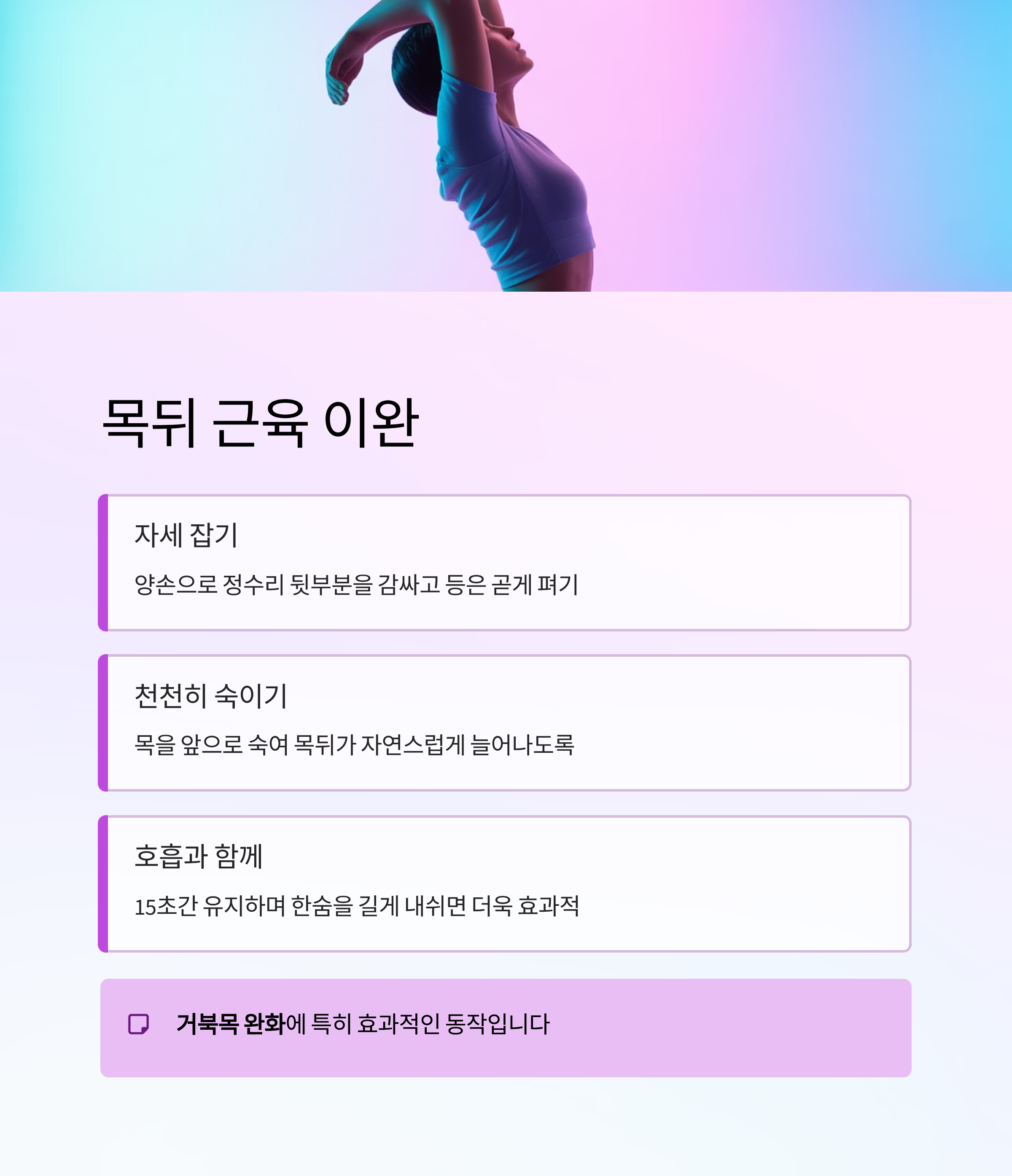 하루에 단 5분만 투자해도 목 주변 근육이 유연해지고, 뭉침으로 인한 불쾌감이 서서히 줄어들게 됩니다.
