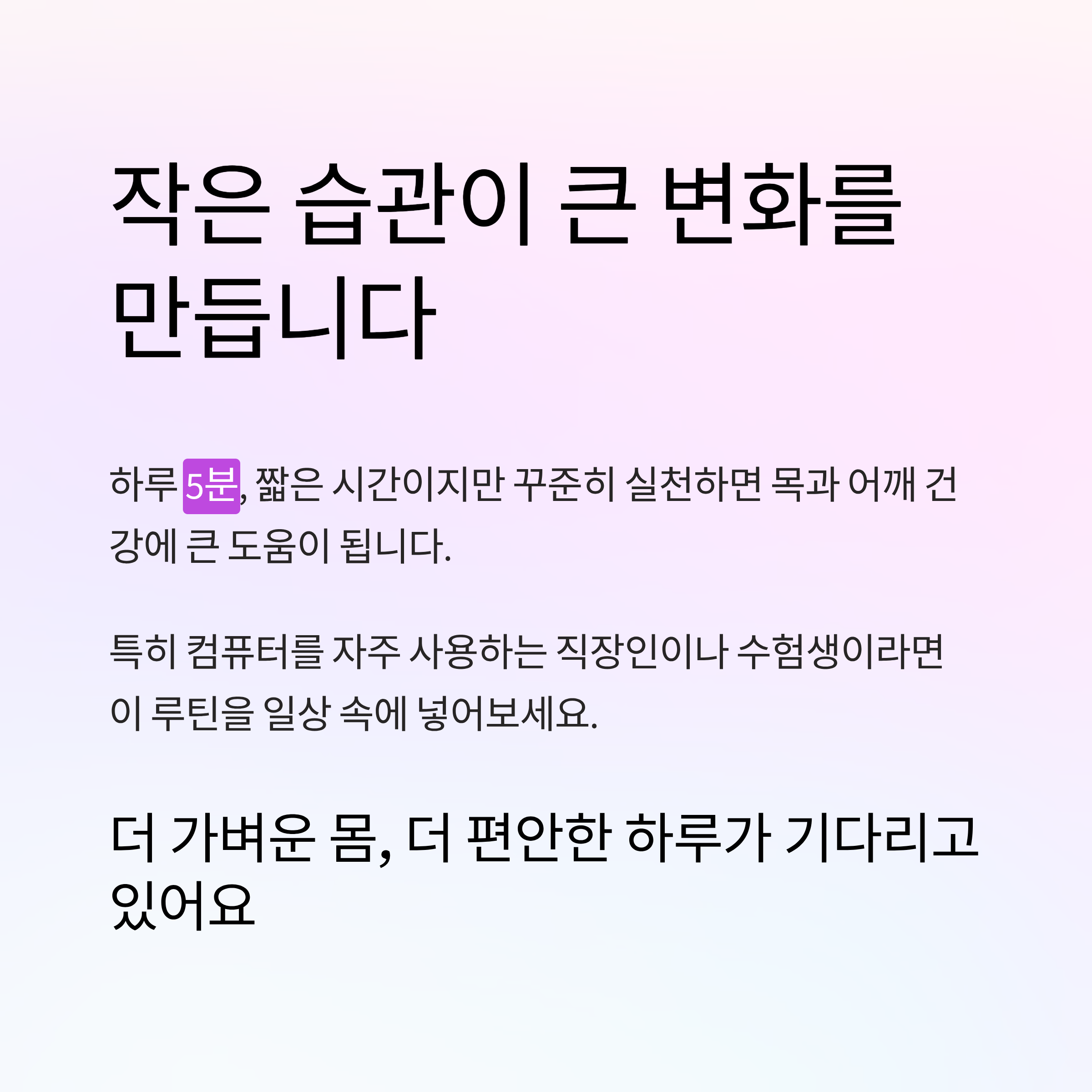 하루 5분, 짧은 시간이지만 꾸준히 실천하면 목과 어깨 건강에 큰 도움이 될 수 있어요.