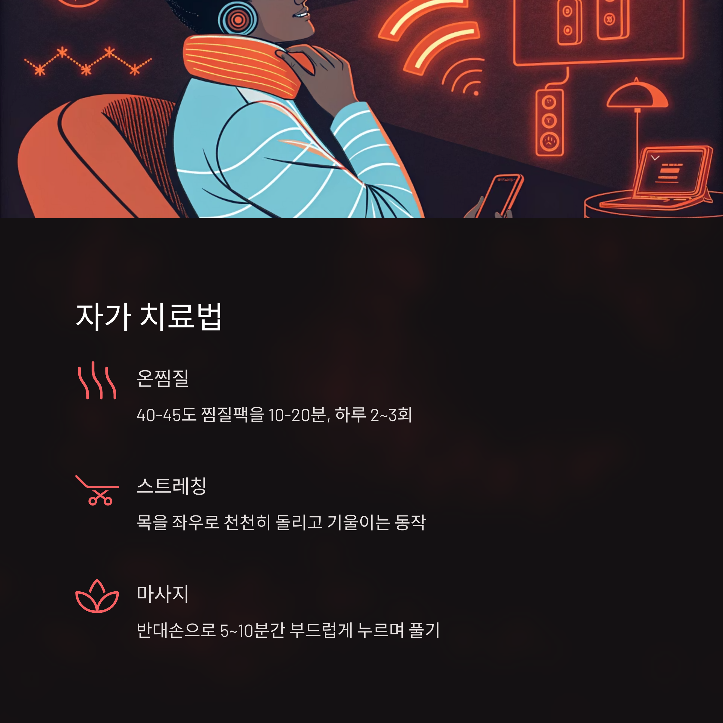 - 스트레칭: 목을 좌우로 천천히 돌리고 기울이는 동작 (무리 금지)