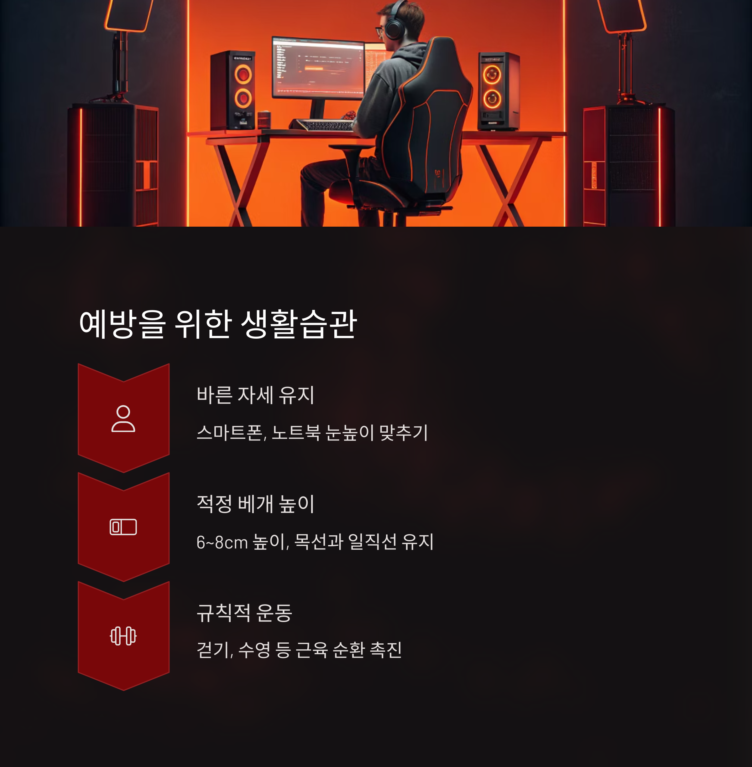 | 바른 자세 유지 | 스마트폰, 노트북 눈높이 맞추기 |