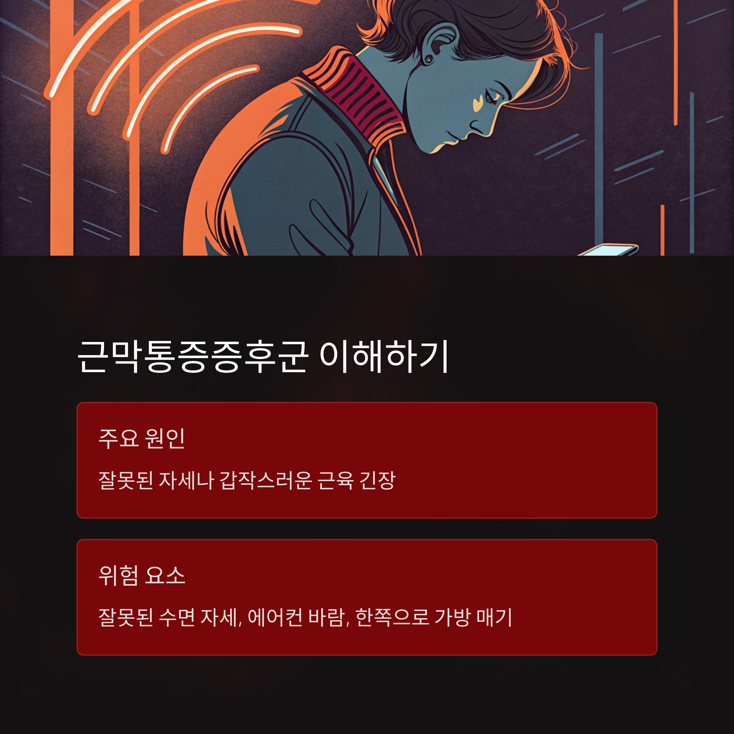 가장 흔한 원인은 근막통증증후군이며, 자세 불균형과 스트레스가 주요 원인입니다