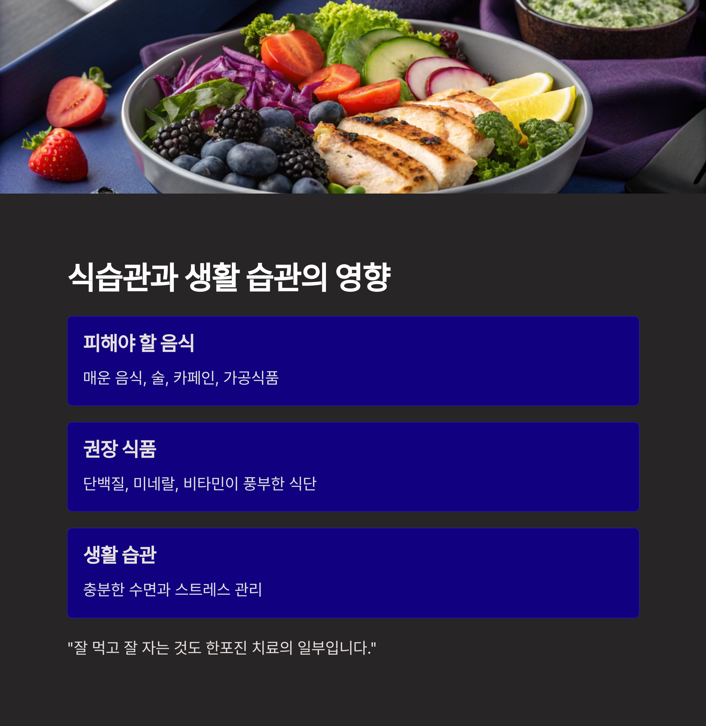 한포진은 면역력과도 관련 있으므로, 식단 조절 역시 중요합니다.