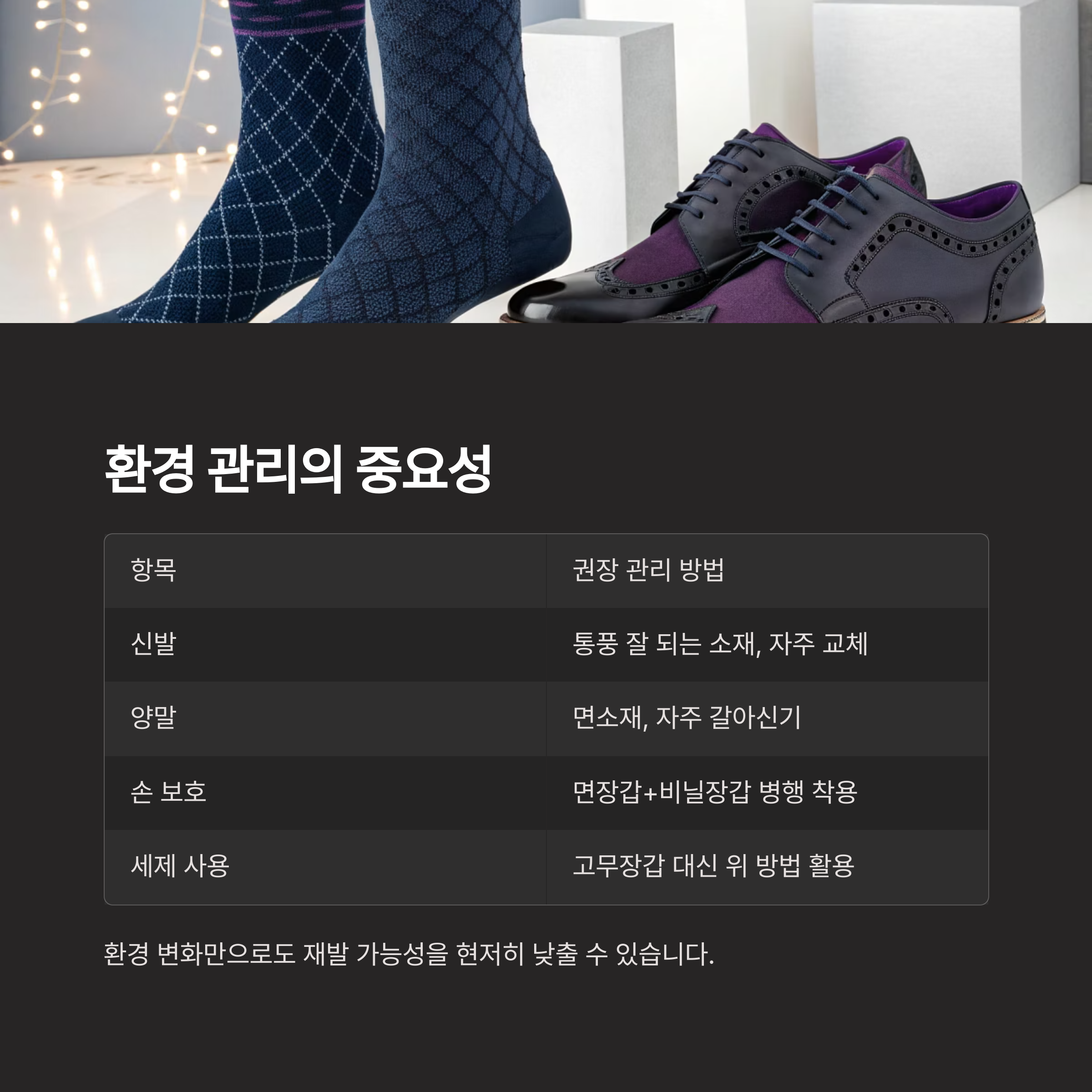 | 신발 | 통풍 잘 되는 소재, 자주 교체 |
