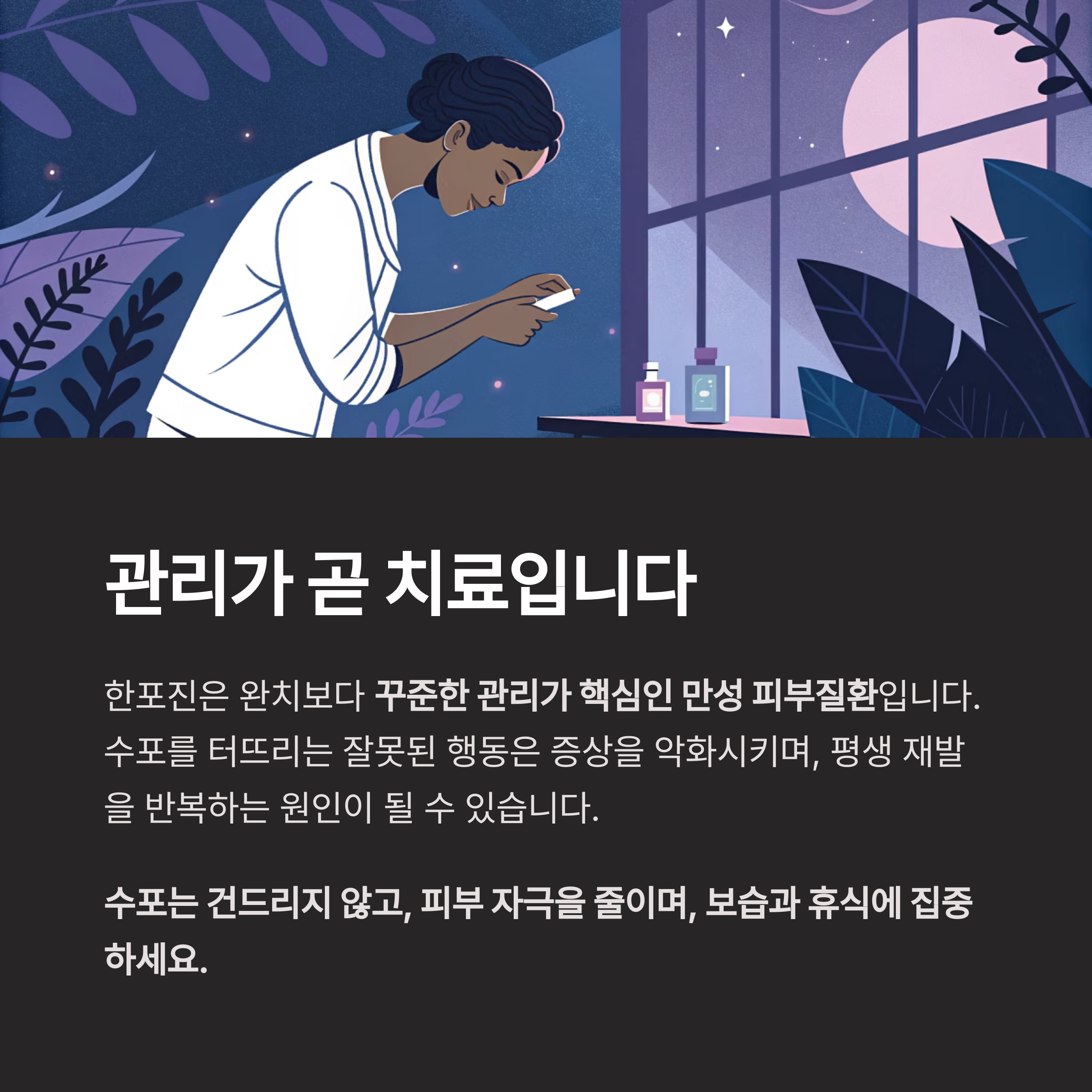 이 말은 한포진 환자에게 현실적으로 어려울 수 있지만, 매우 중요합니다.