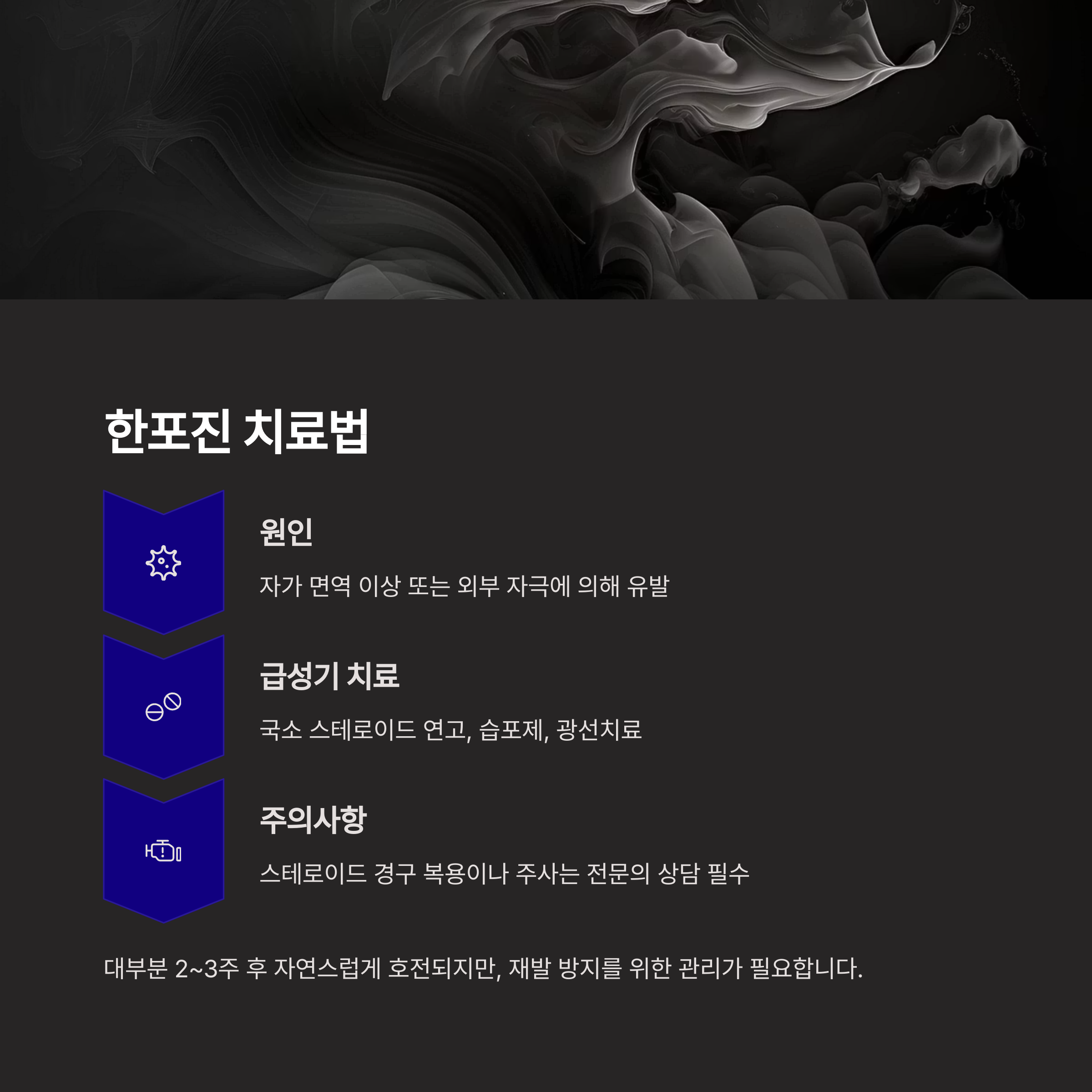 급성기에는 국소 스테로이드 연고, 습포제, 광선치료 등이 활용됩니다.