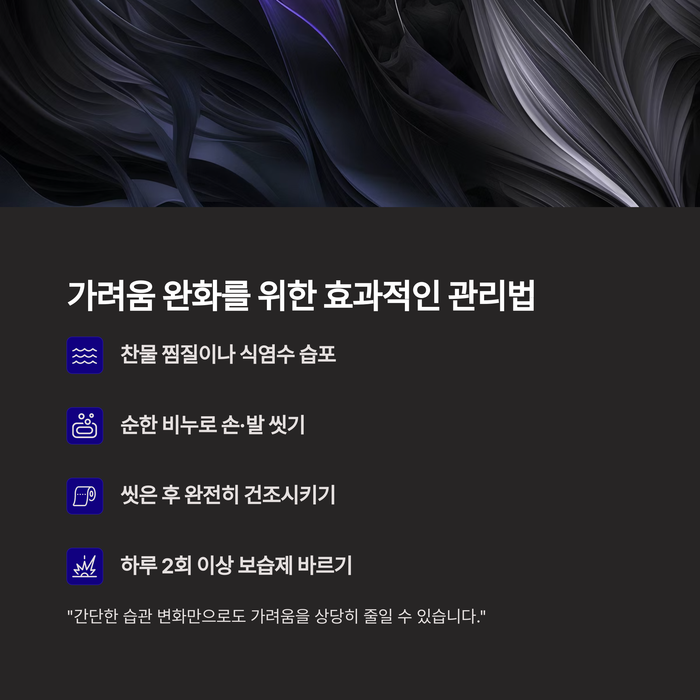 한포진의 가려움은 참기 힘들지만, 아래 방법을 활용하면 증상 완화에 도움이 됩니다.