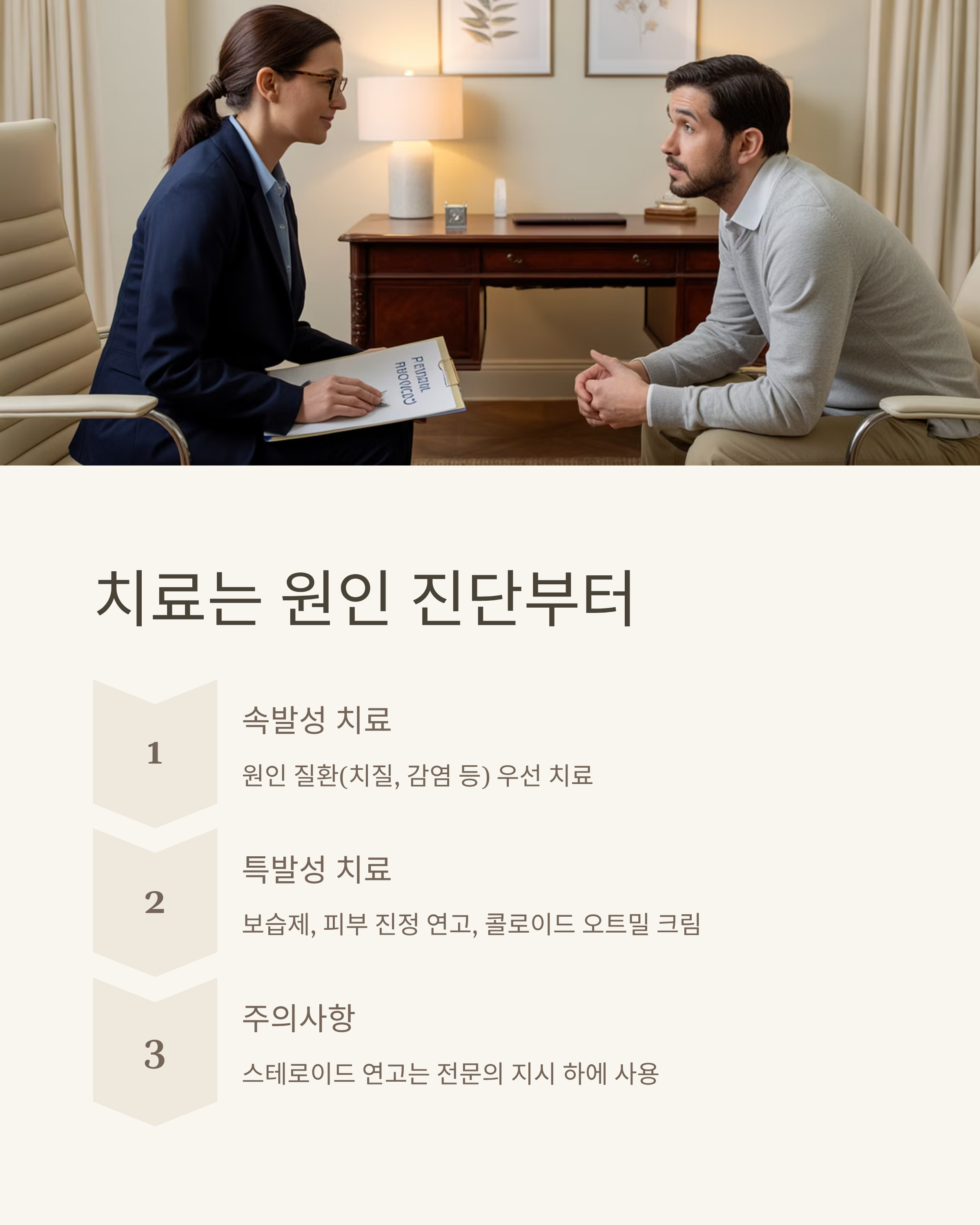 특발성이라면 증상 완화를 위한 보습제, 피부 진정 연고, 콜로이드 오트밀 크림 등이 사용됩니다.