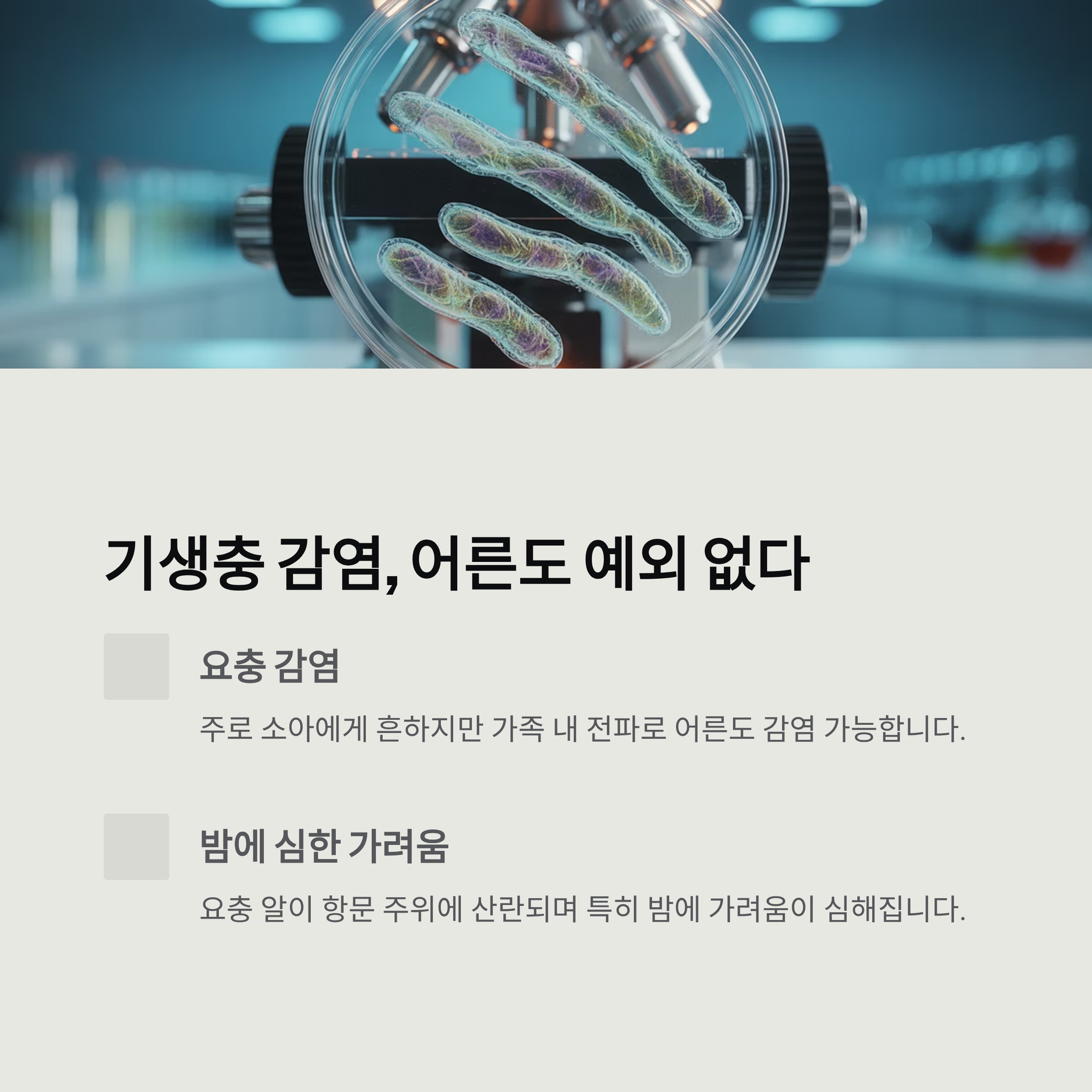 요충 감염은 주로 소아에게 흔하지만, 가족 내 전파가 쉽게 이뤄지는 만큼 어른도 예외는 아닙니다.