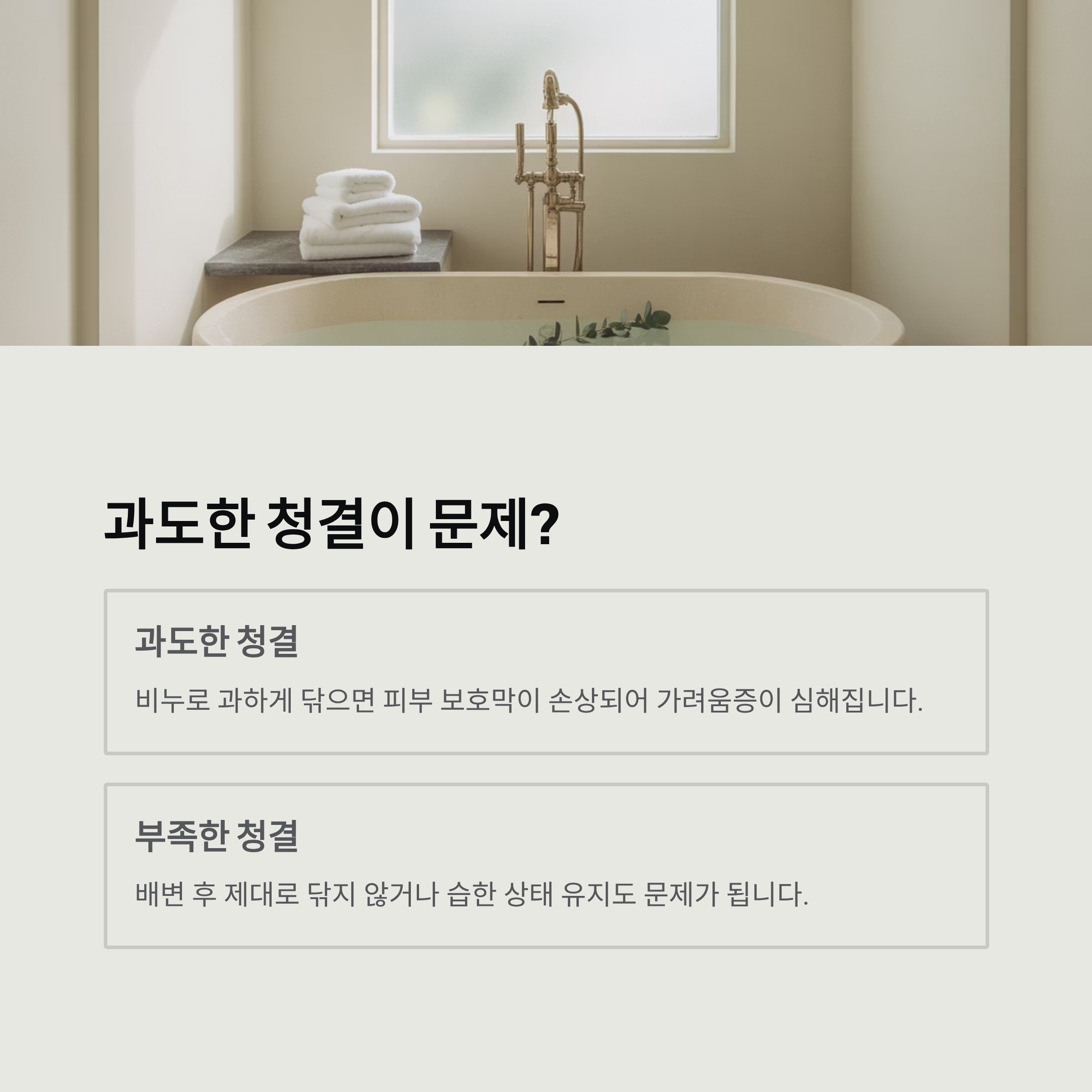 비누, 바디클렌저 등으로 과하게 닦다 보면 피부 보호막이 손상되면서 오히려 가려움증이 심해지죠. 반대로 배변 후 제대로 닦지 않거나 습한 상태를 유지하는 것도 문제입니다.