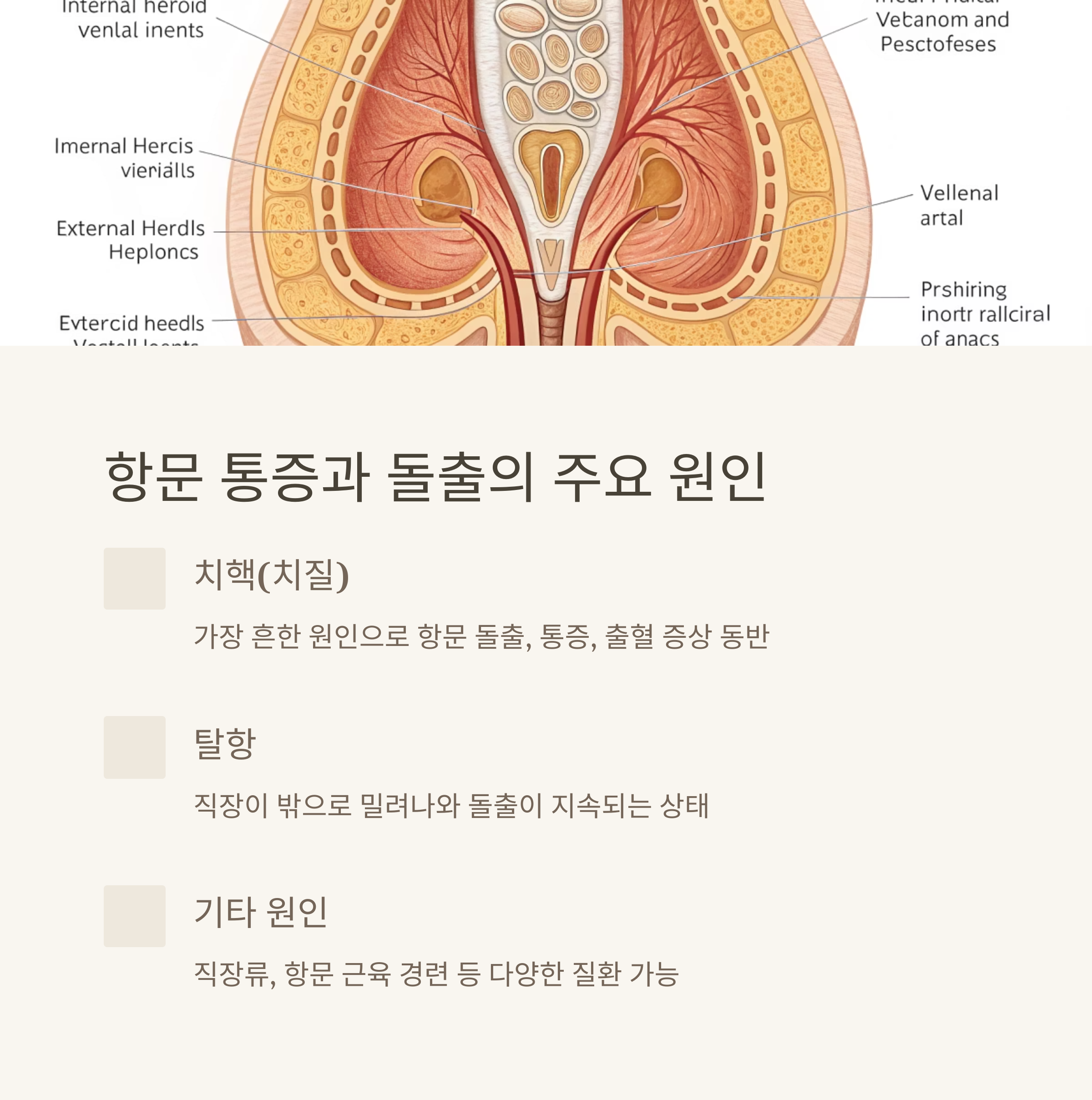 치핵 외에도 탈항, 직장류, 항문 근육 경련 등 다양한 원인이 있으며, 증상과 발현 양상이 조금씩 다릅니다.