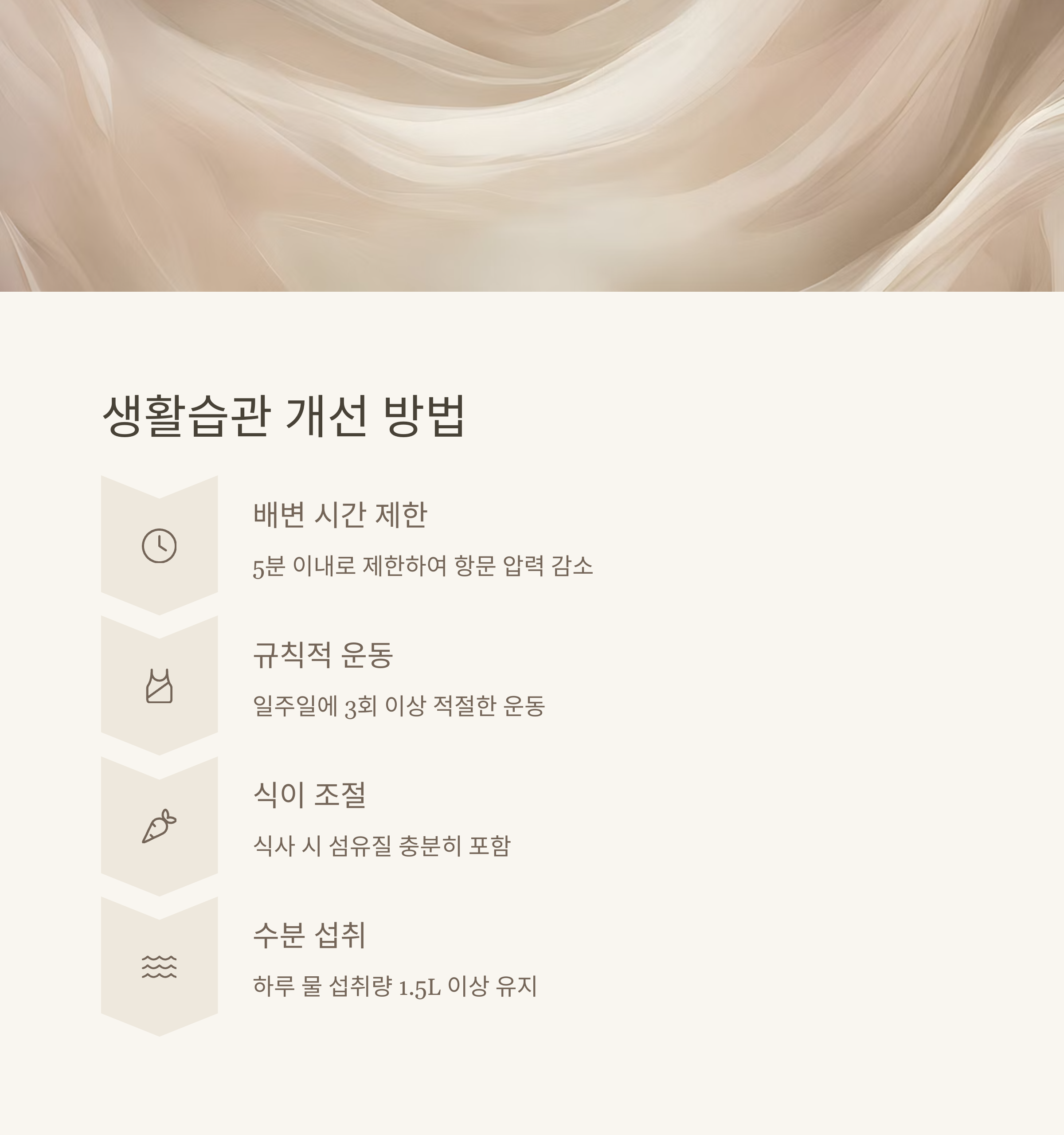 | 식이 개선 | 섬유질 섭취 증가, 물 충분히 마시기 |