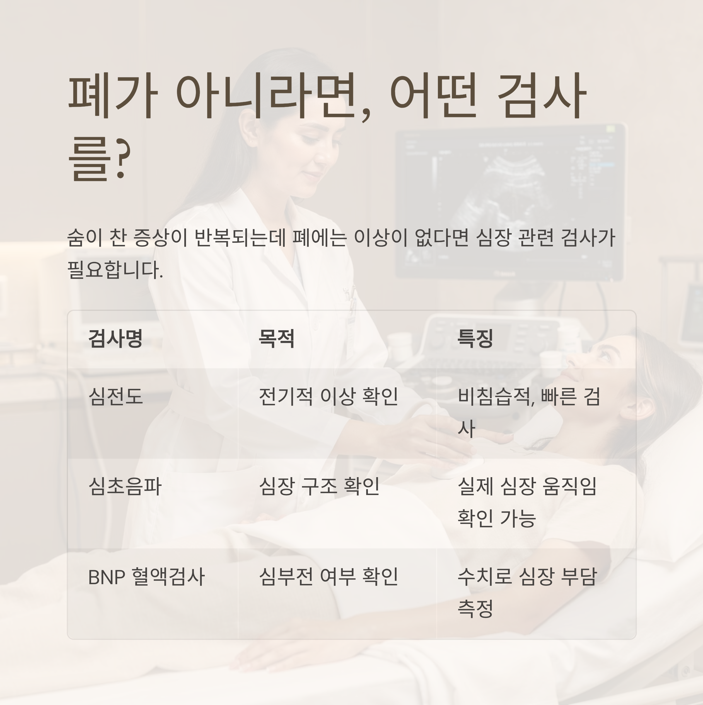 숨이 찬 증상이 반복되는데 폐에는 이상이 없다면 심장 관련 검사가 필요합니다. 대표적인 검사는 심전도, 심초음파, 혈액검사 등이 있으며 이를 통해 심장의 구조와 기능을 파악할 수 있어요.