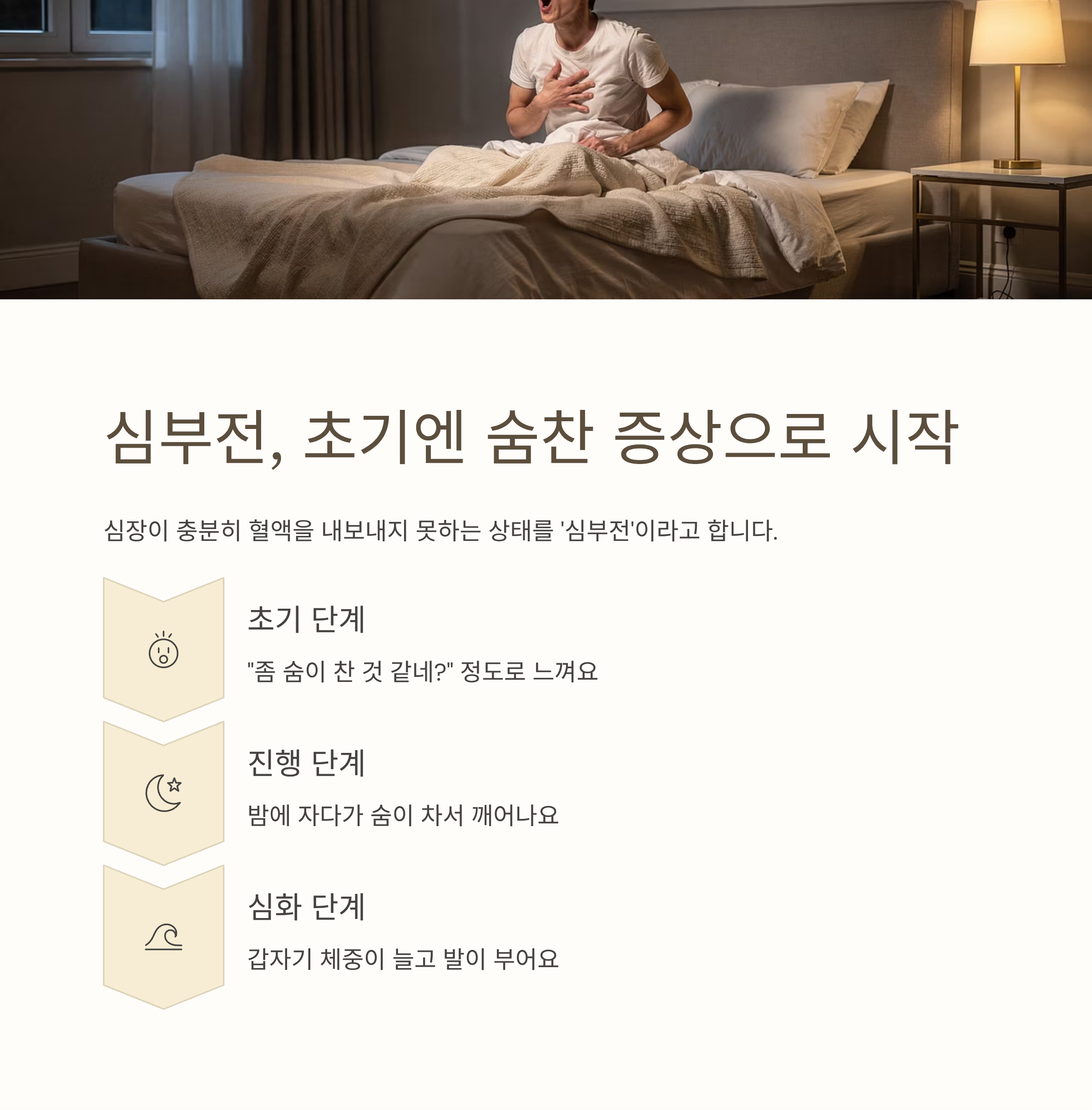 심장이 충분히 혈액을 내보내지 못하는 상태를 ‘심부전’이라고 합니다. 초기에는 단순히 "좀 숨이 찬 것 같네?"라고 느끼는 수준이지만, 진행되면 밤에 자다가 숨이 차서 깨거나, 갑자기 체중이 늘고 발이 붓는 등의 증상이 나타날 수 있어요. 특히 계단 오르기가 힘들어진다면 더욱 주의해야 합니다.