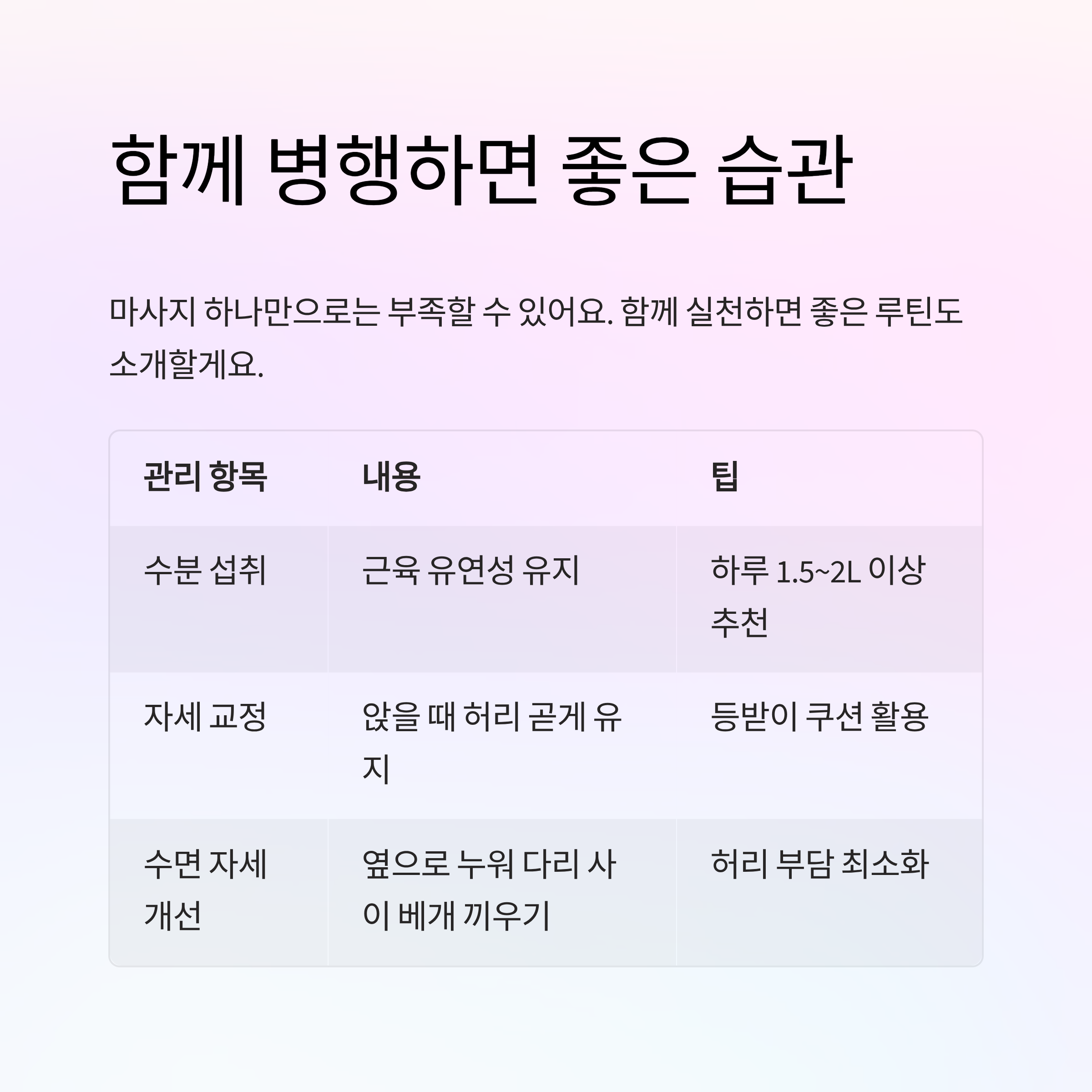 | 수분 섭취 | 근육 유연성 유지 | 하루 1.5~2L 이상 추천 |