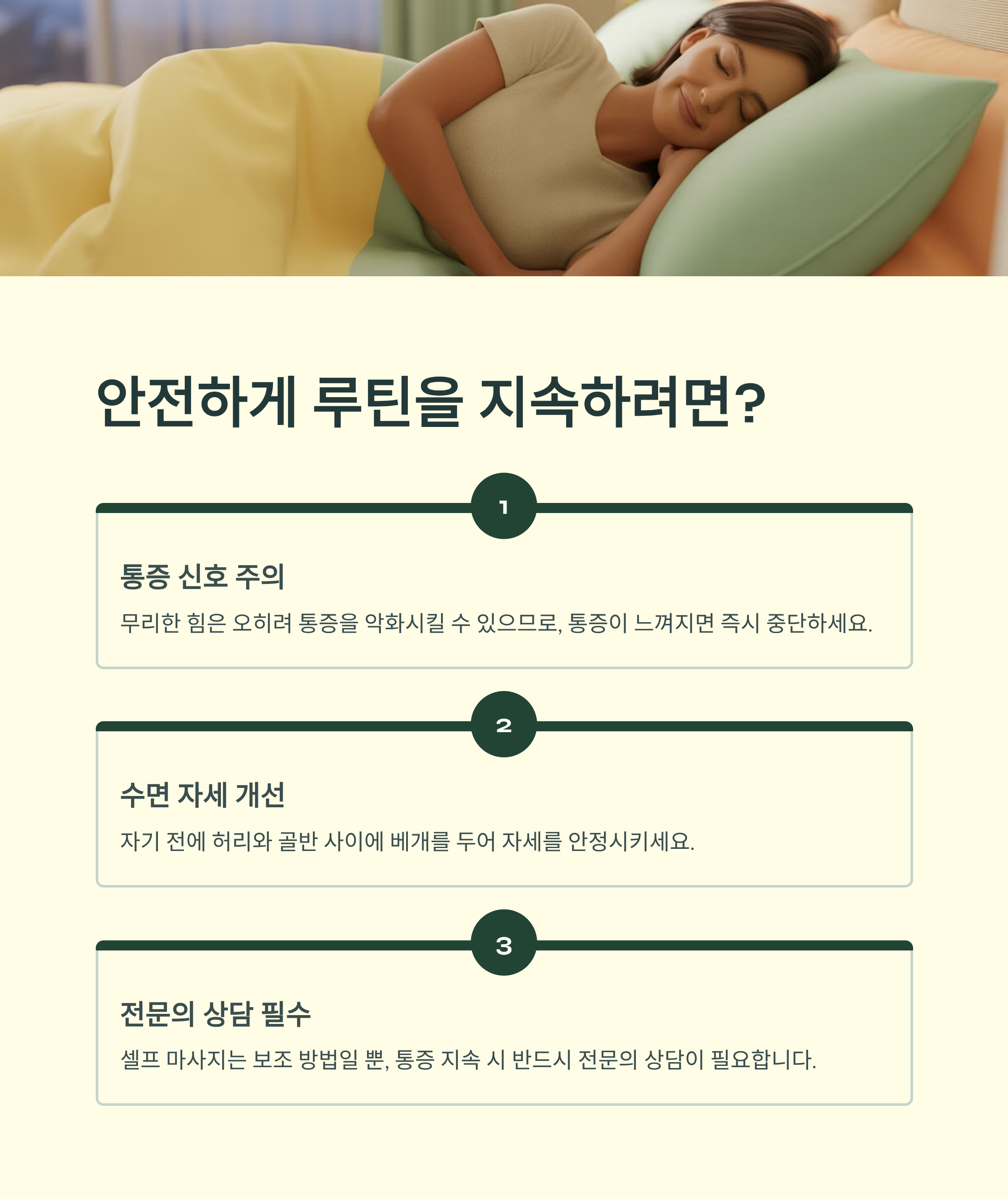 잠자기 전 5분, 나만의 루틴으로 허리의 긴장을 부드럽게 풀어보세요. 단, 언제나 자신의 몸 상태를 먼저 체크하고, 조금이라도 이상이 느껴진다면 전문가의 의견을 우선으로 하셔야 합니다.