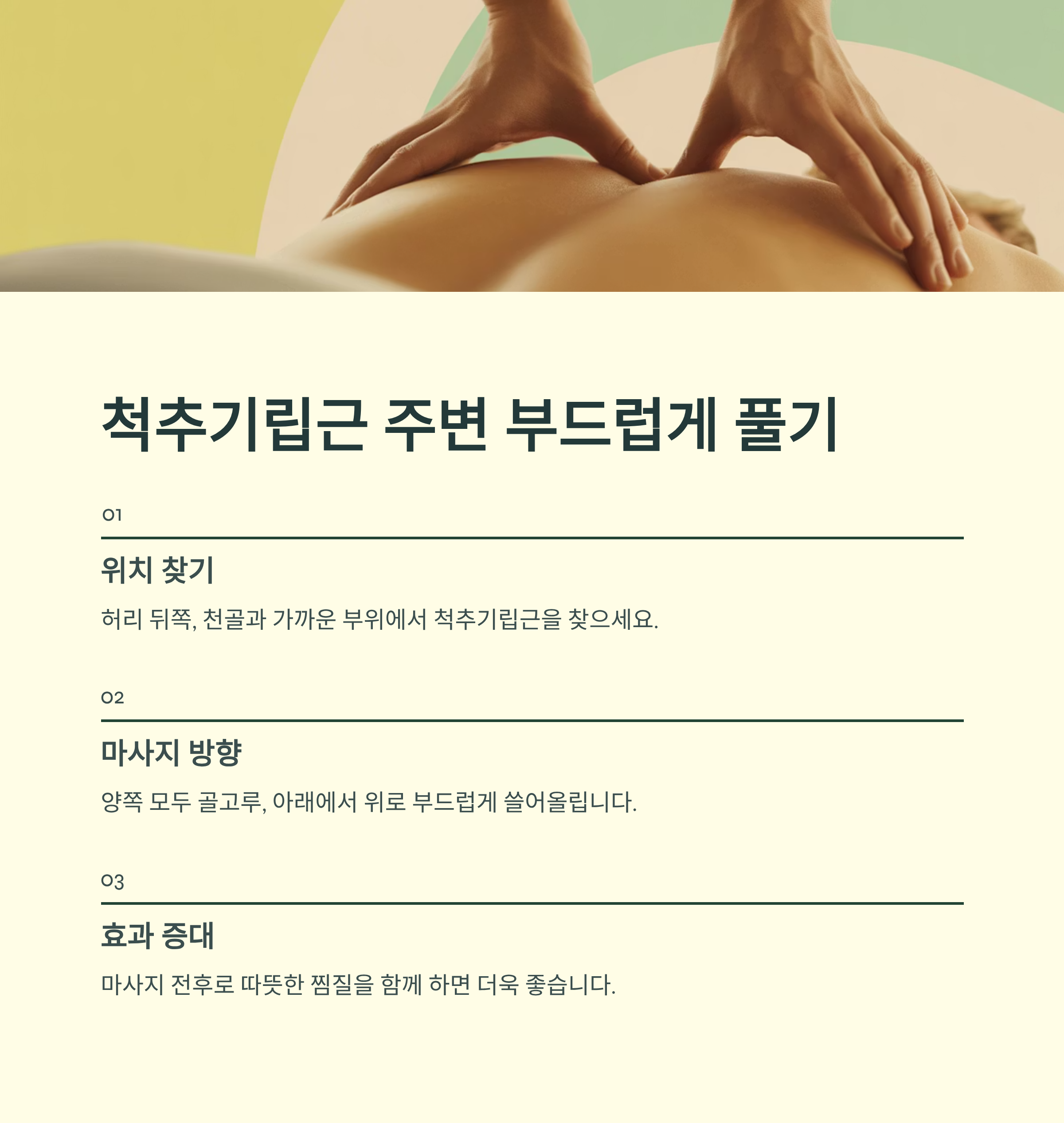 | 척추기립근 마사지 | 허리 근육 이완 | 천천히 아래에서 위로 쓸어올리기 |