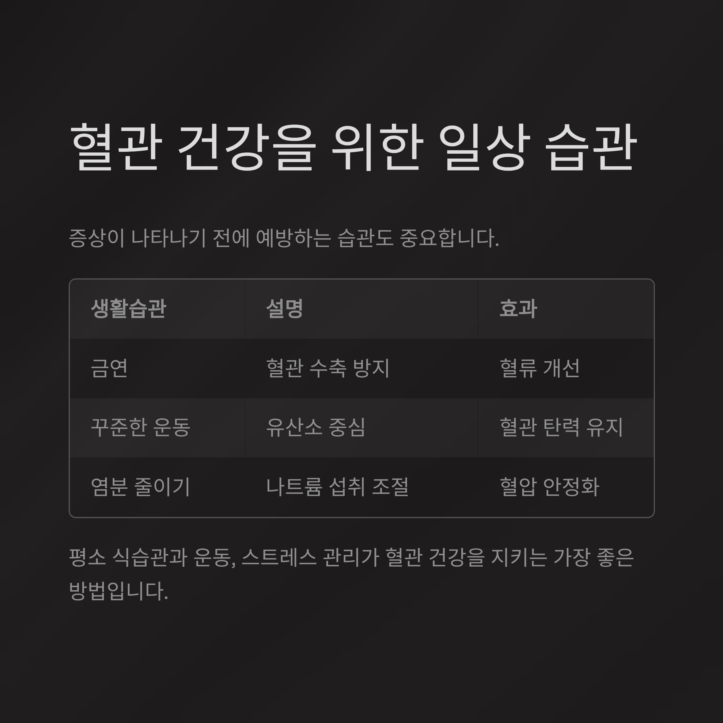 평소 식습관과 운동, 스트레스 관리가 혈관 건강을 지키는 가장 좋은 방법입니다.