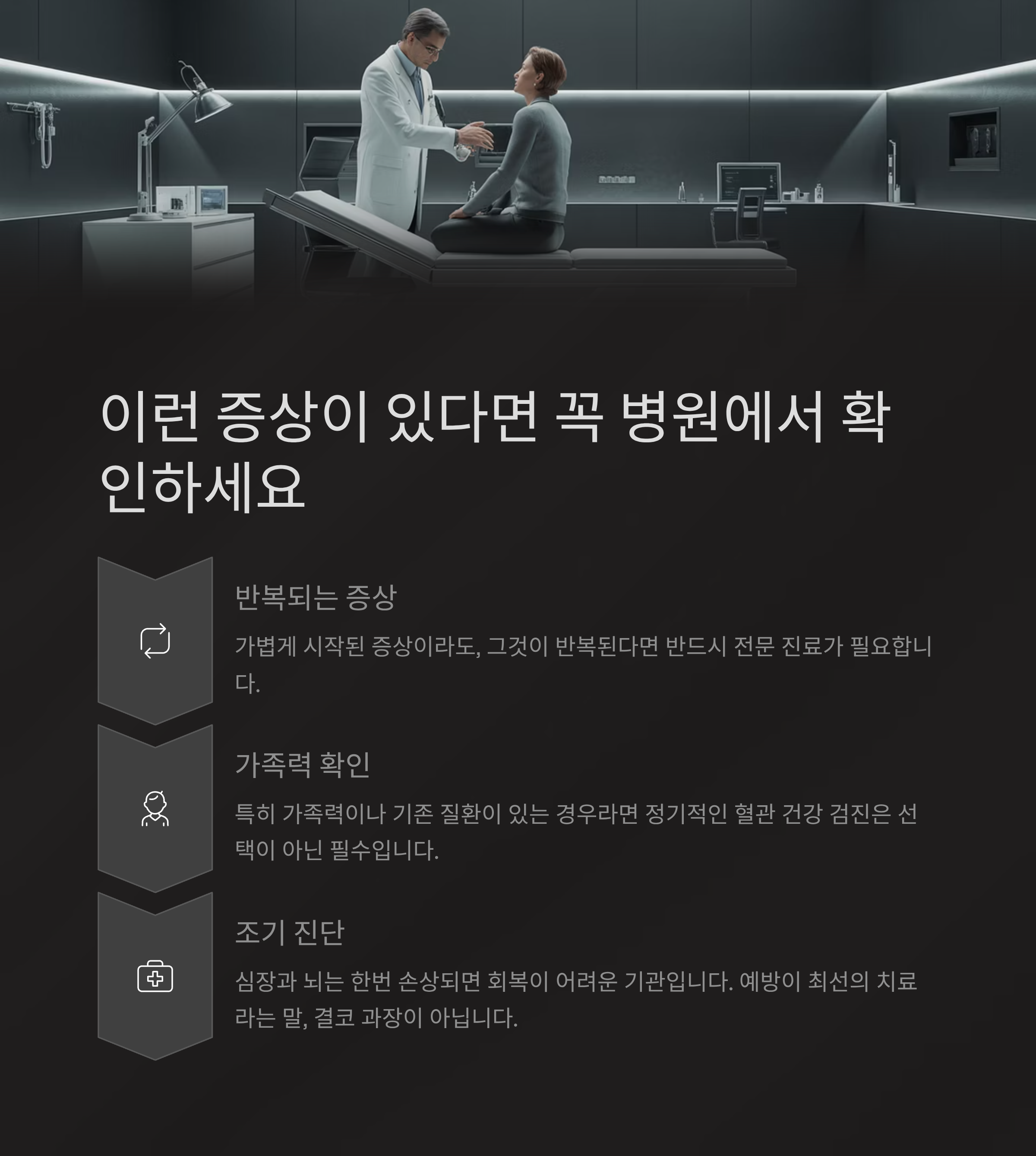 가볍게 시작된 증상이라도, 그것이 반복된다면 반드시 전문 진료가 필요합니다. 특히 가족력이나 기존 질환이 있는 경우라면 정기적인 혈관 건강 검진은 선택이 아닌 필수입니다.