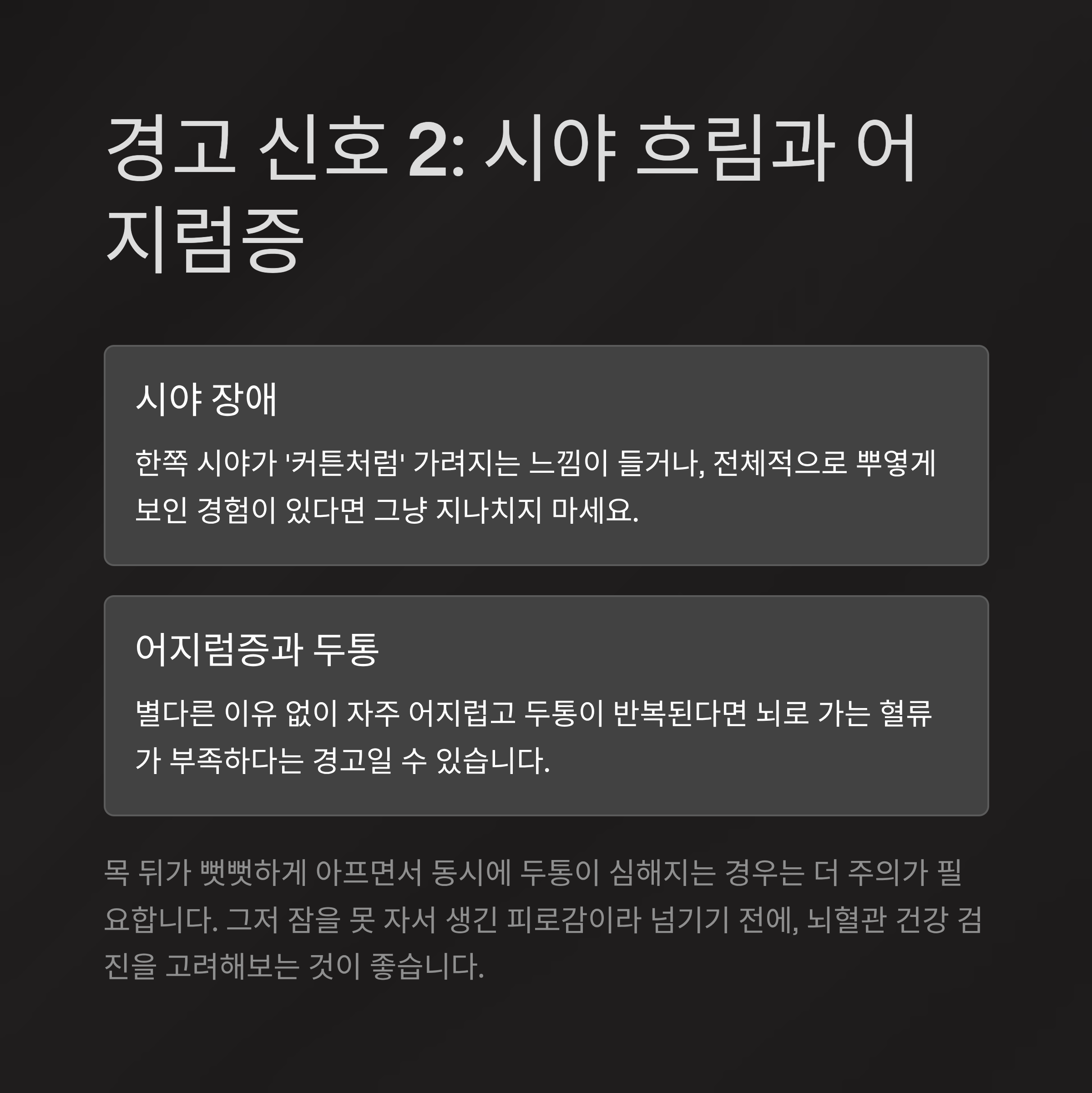 목 뒤가 뻣뻣하게 아프면서 동시에 두통이 심해지는 경우는 더 주의가 필요합니다. 그저 잠을 못 자서 생긴 피로감이라 넘기기 전에, 뇌혈관 건강 검진을 고려해보는 것이 좋습니다.