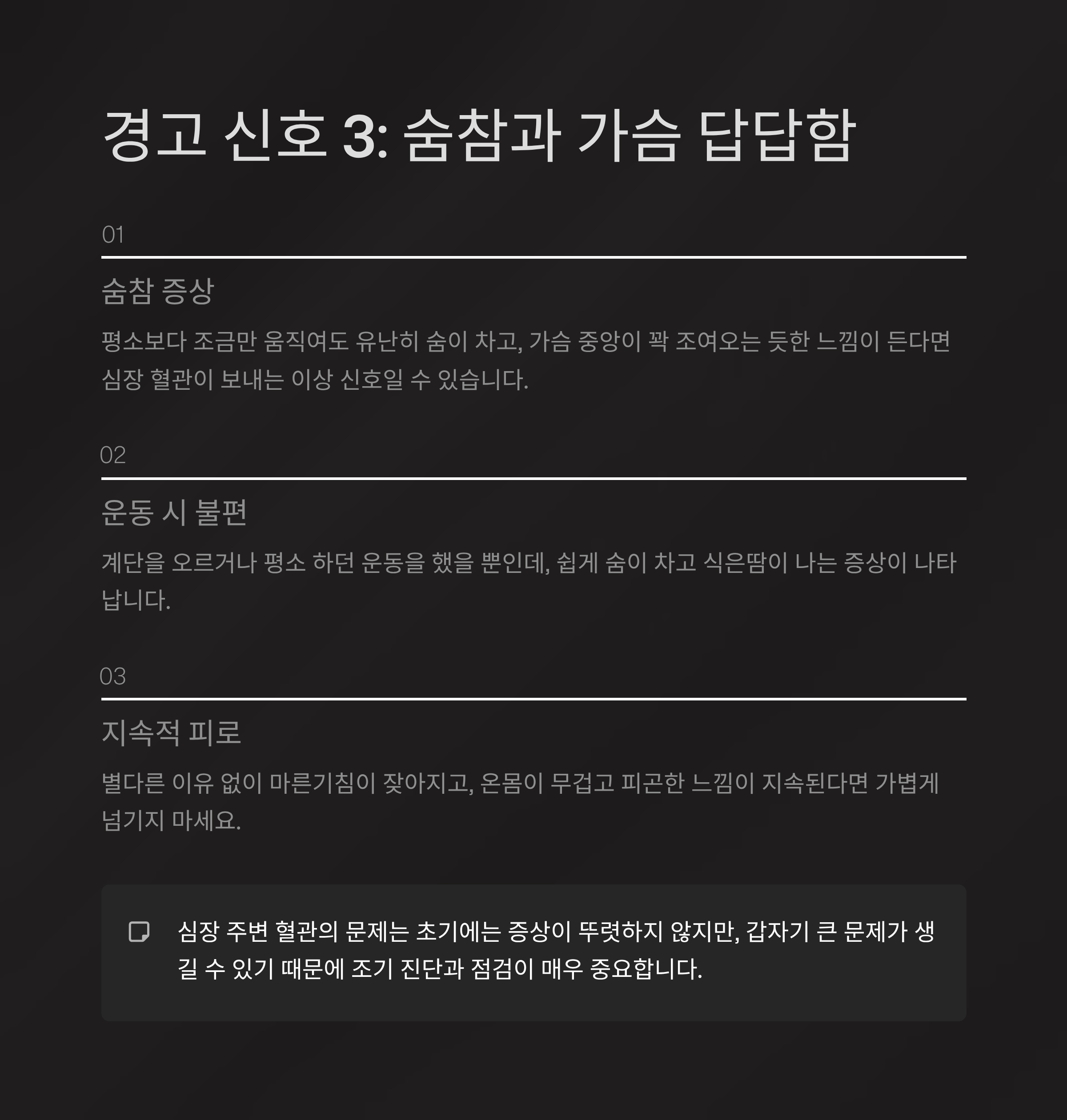 평소보다 조금만 움직여도 유난히 숨이 차고, 가슴 중앙이 꽉 조여오는 듯한 느낌이 든다면 심장 혈관이 보내는 이상 신호일 수 있습니다.