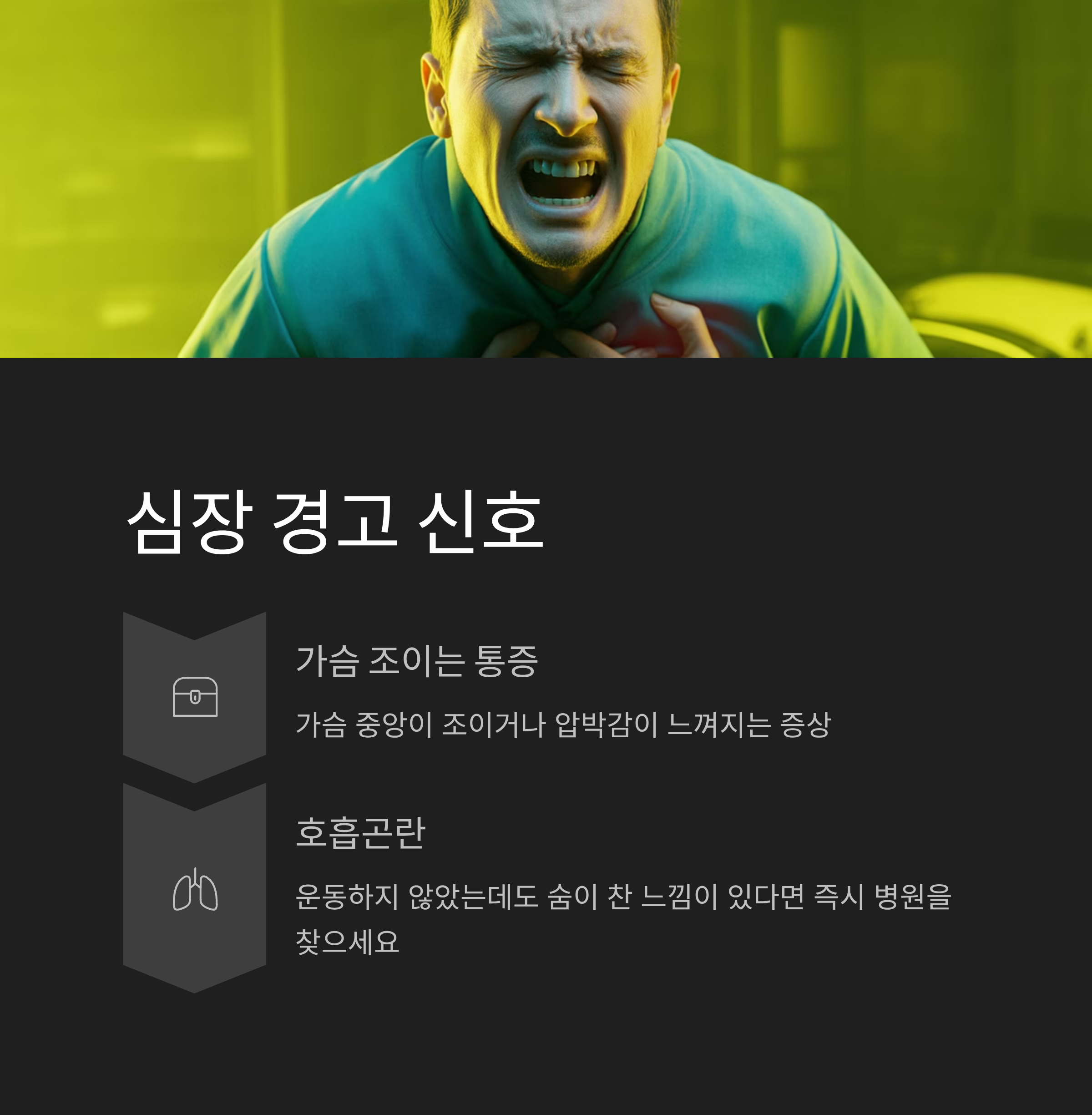 심장 관련 질환의 대표적인 전조 증상은 가슴의 조이는 듯한 통증과 함께 호흡곤란입니다.