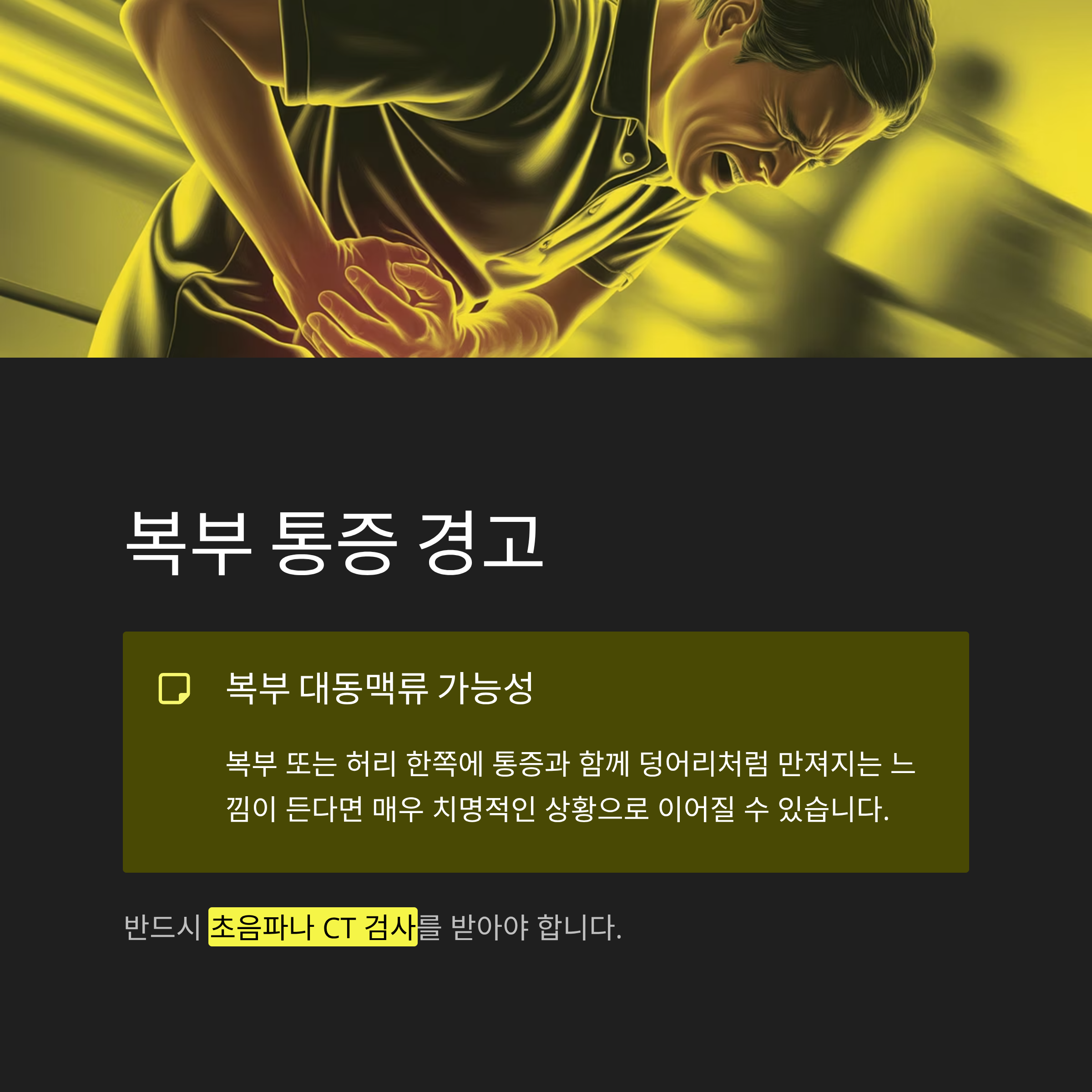 복부 또는 허리 한쪽에 통증과 함께 덩어리처럼 만져지는 느낌이 든다면, 복부 대동맥류 가능성이 있습니다.