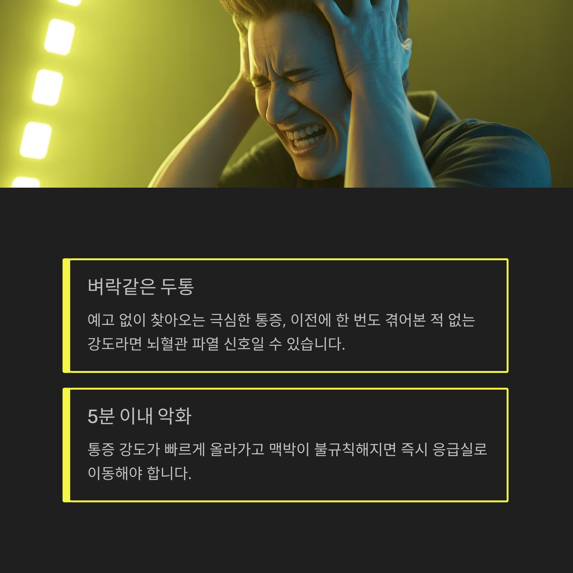 예고 없이 '벼락치듯' 찾아오는 두통, 특히 이전에 한 번도 겪어본 적 없는 통증이라면 뇌혈관 파열의 신호일 수 있습니다.