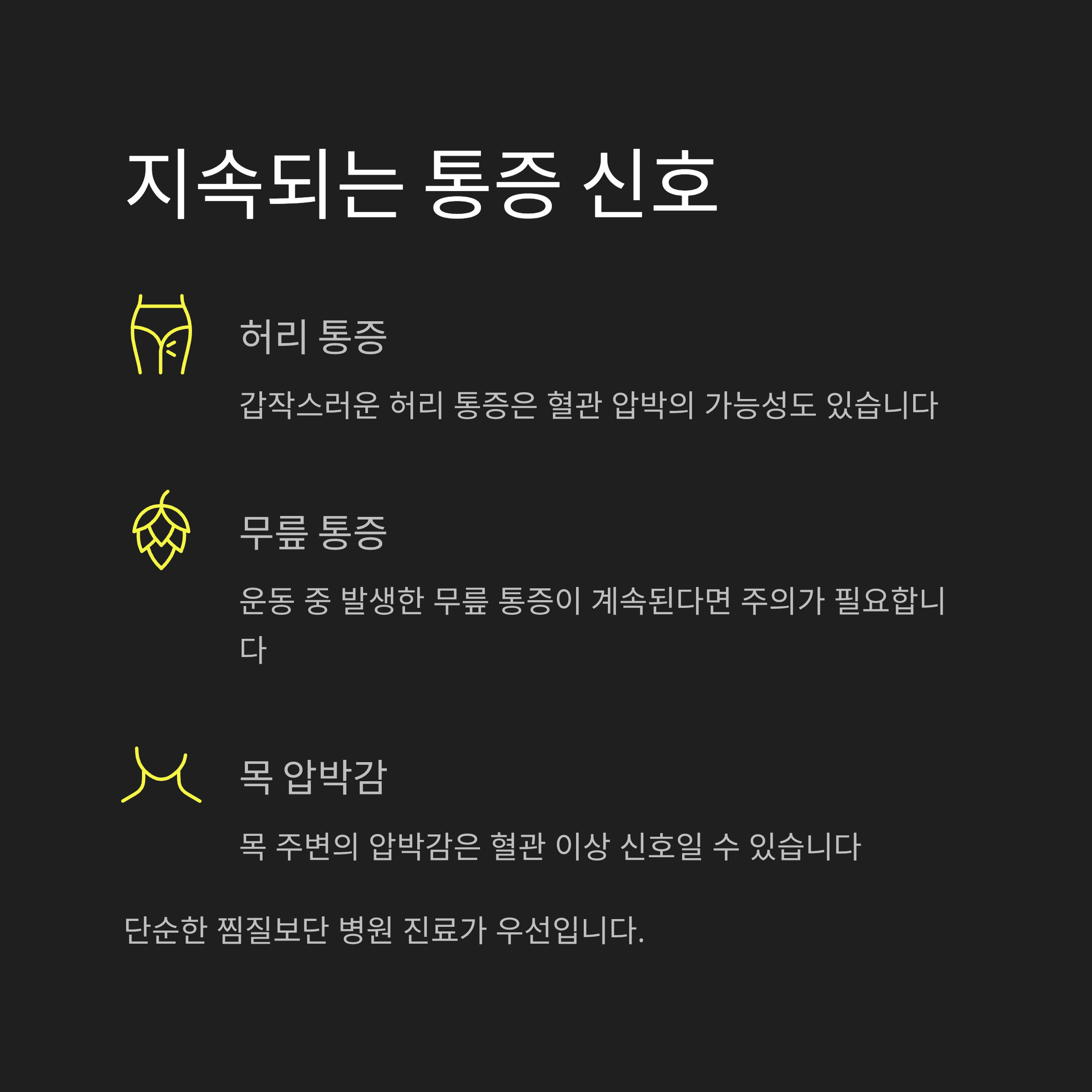 특히 운동 중 갑작스러운 허리나 무릎 통증, 목 주변의 압박감은 '근육통'이 아닌 '혈관 압박'의 가능성도 있다는 점.