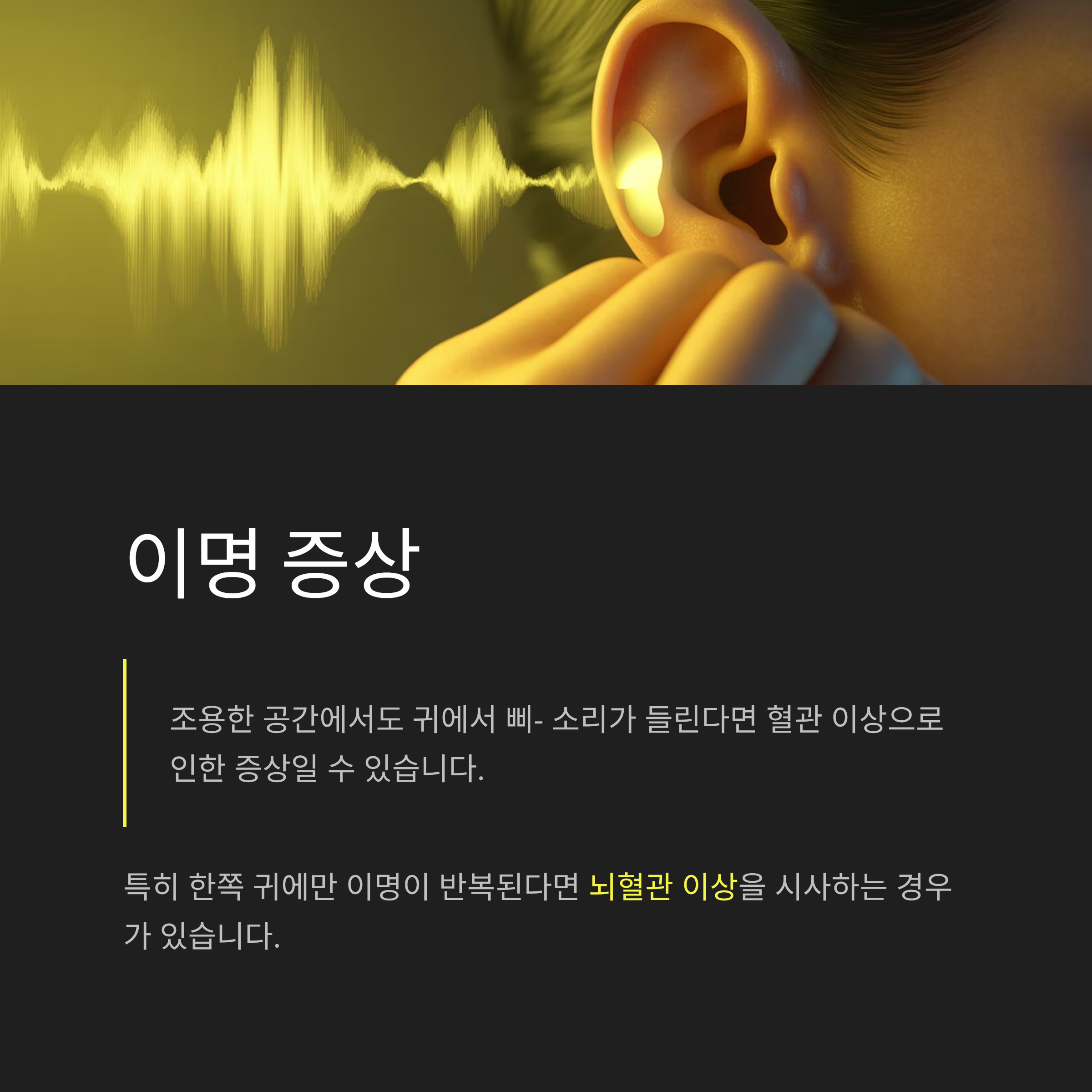 특히 한쪽 귀에만 이명이 반복된다면 뇌혈관 이상을 시사하는 경우가 있어요.