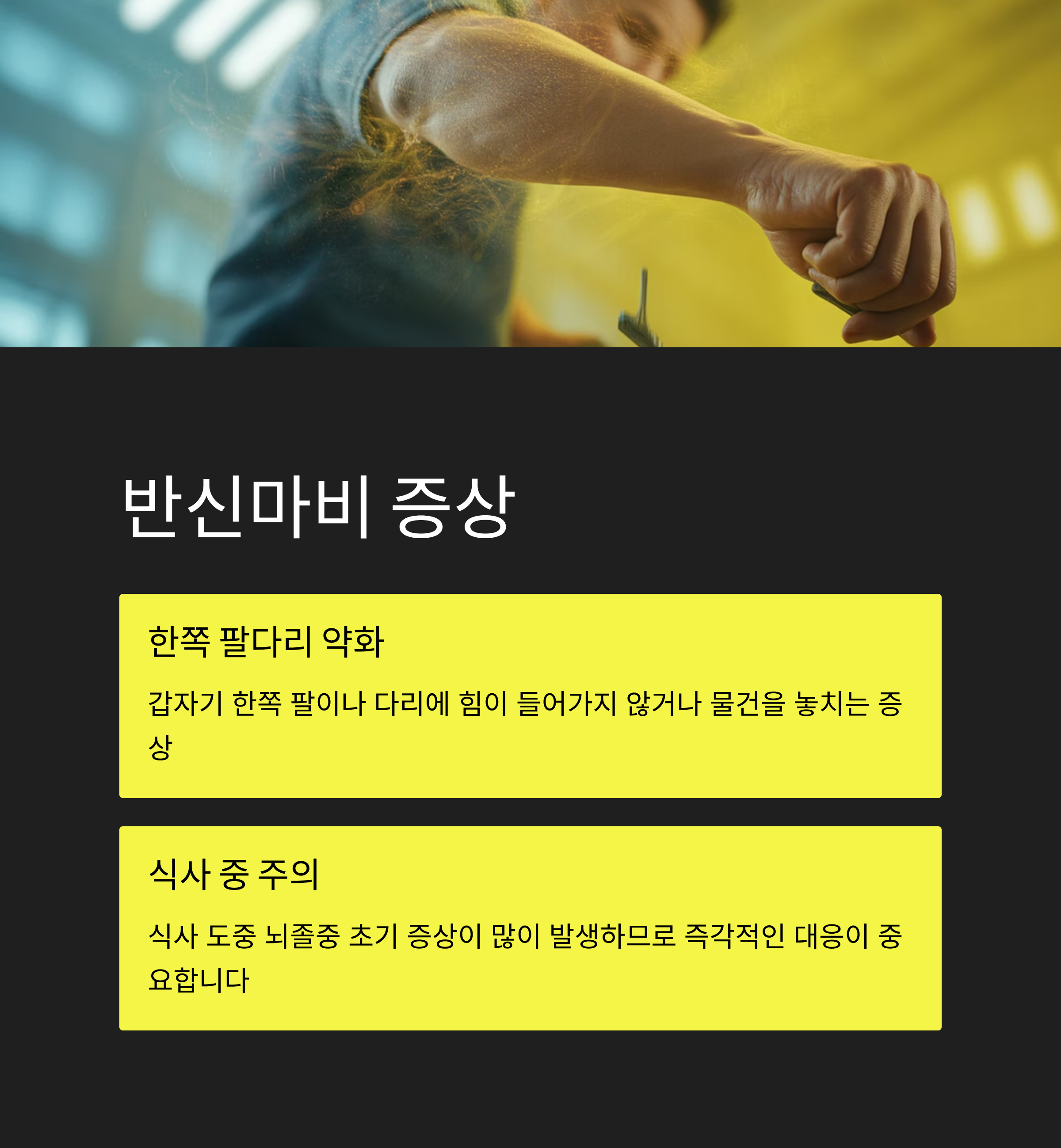 갑자기 한쪽 팔이나 다리에 힘이 들어가지 않거나, 물건을 놓치는 등 이상한 느낌이 든다면 뇌졸중 혹은 혈관 이상을 의심해야 합니다.