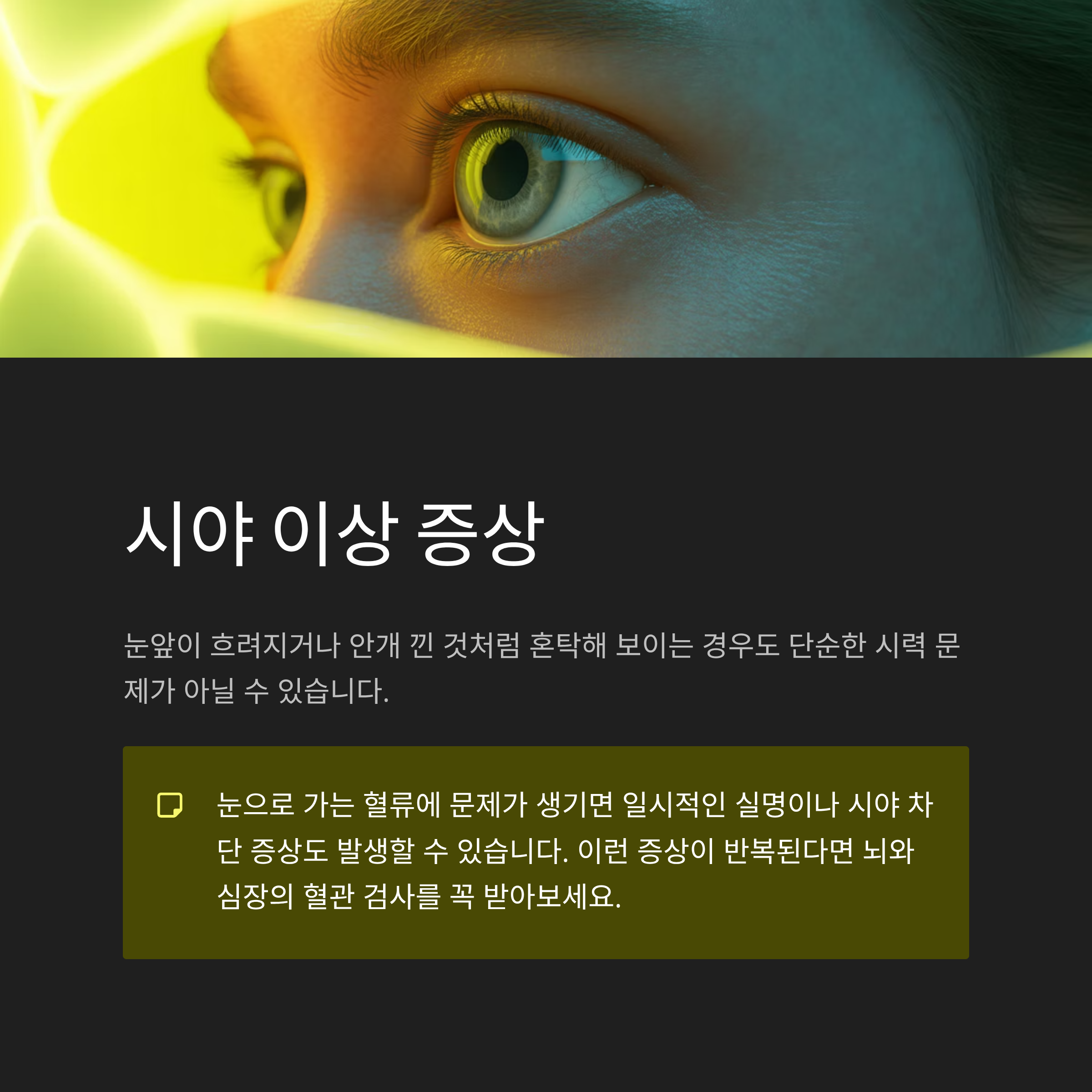 눈으로 가는 혈류에 문제가 생기면 일시적인 실명이나 시야 차단 증상도 발생할 수 있기 때문이죠.