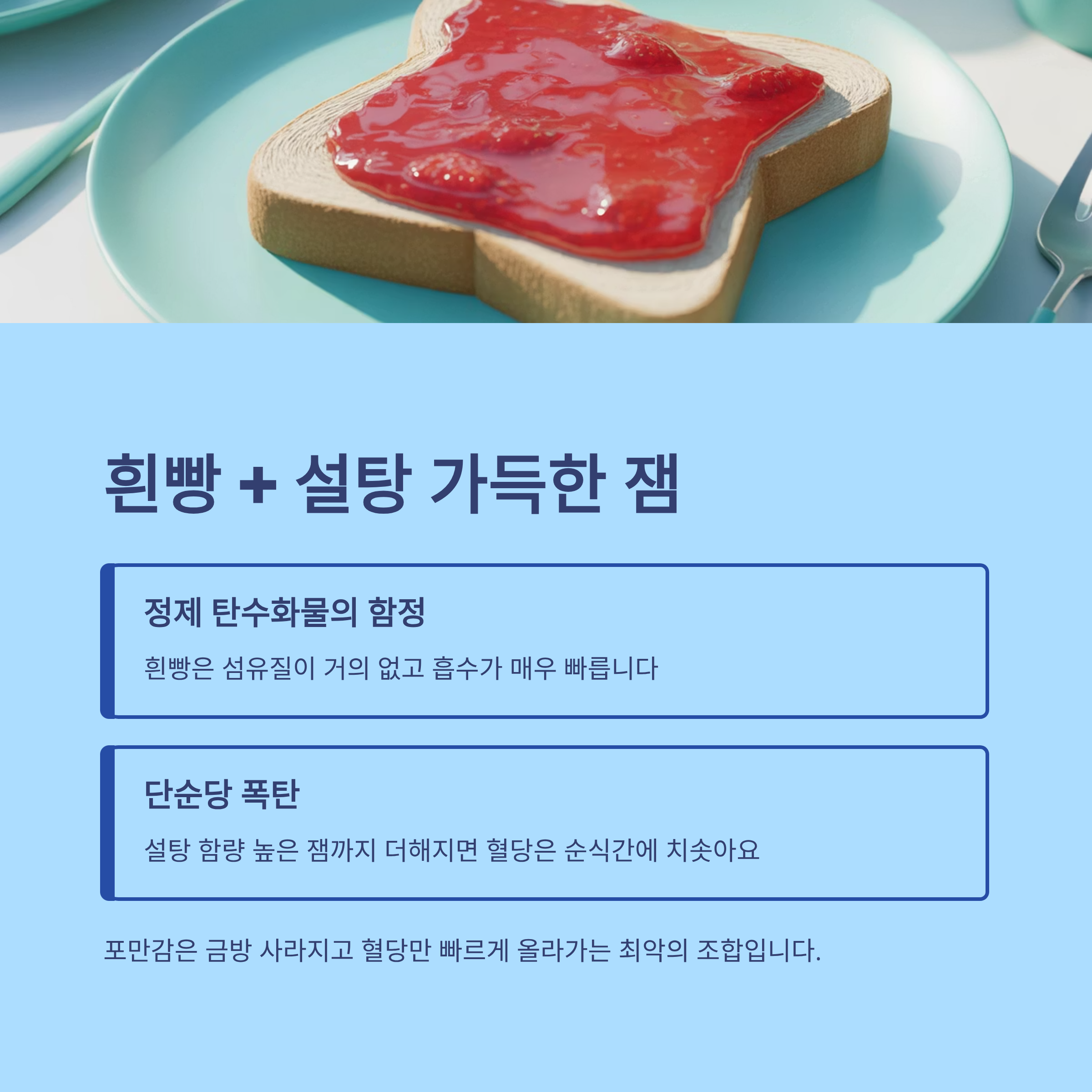 흰빵은 섬유질이 거의 없고 흡수가 빠르며, 여기에 설탕 함량 높은 잼까지 더해지면 혈당은 순식간에 치솟습니다.