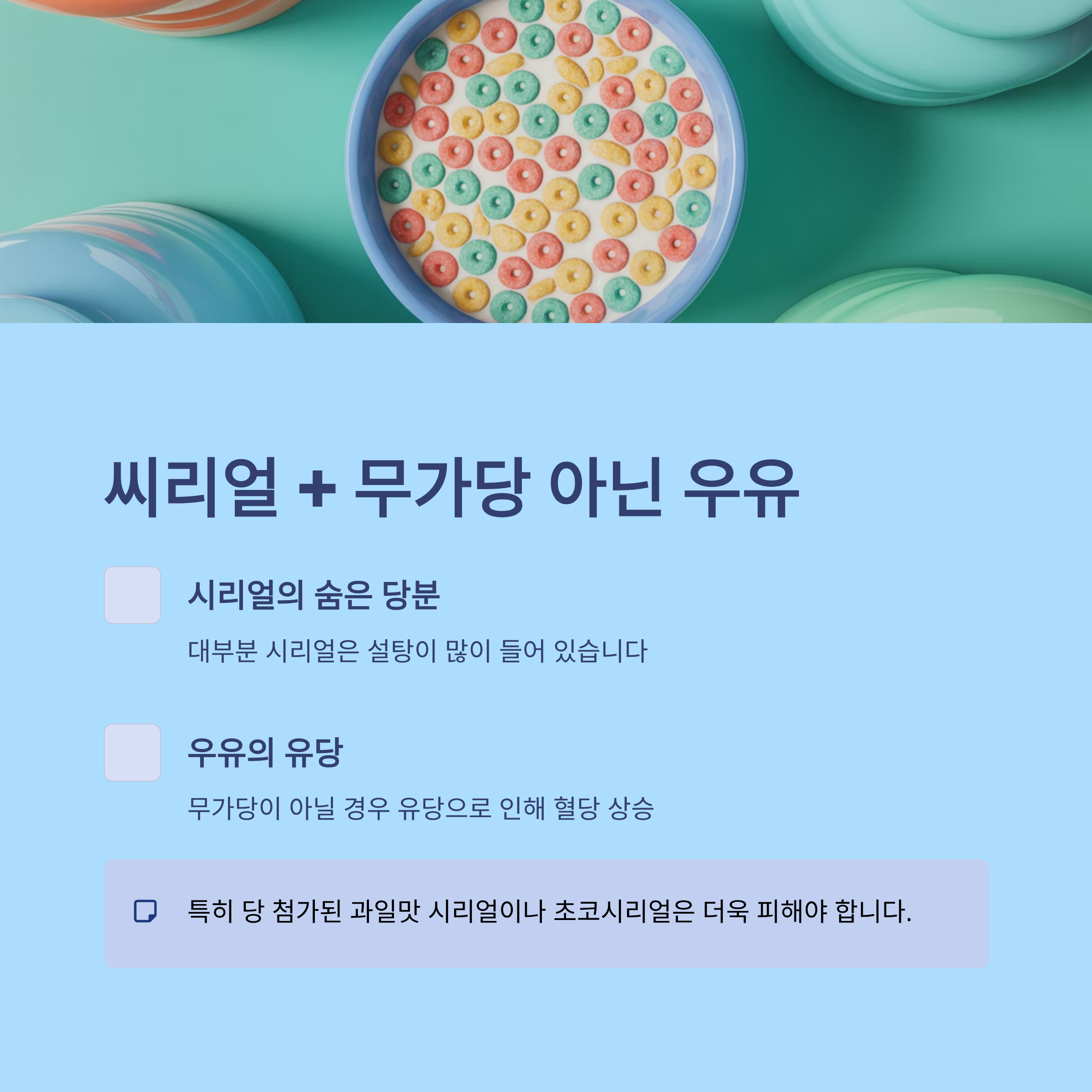 대부분 시리얼은 설탕이 많이 들어 있고, 우유도 무가당이 아닐 경우 유당으로 인해 혈당이 오를 수 있어요.