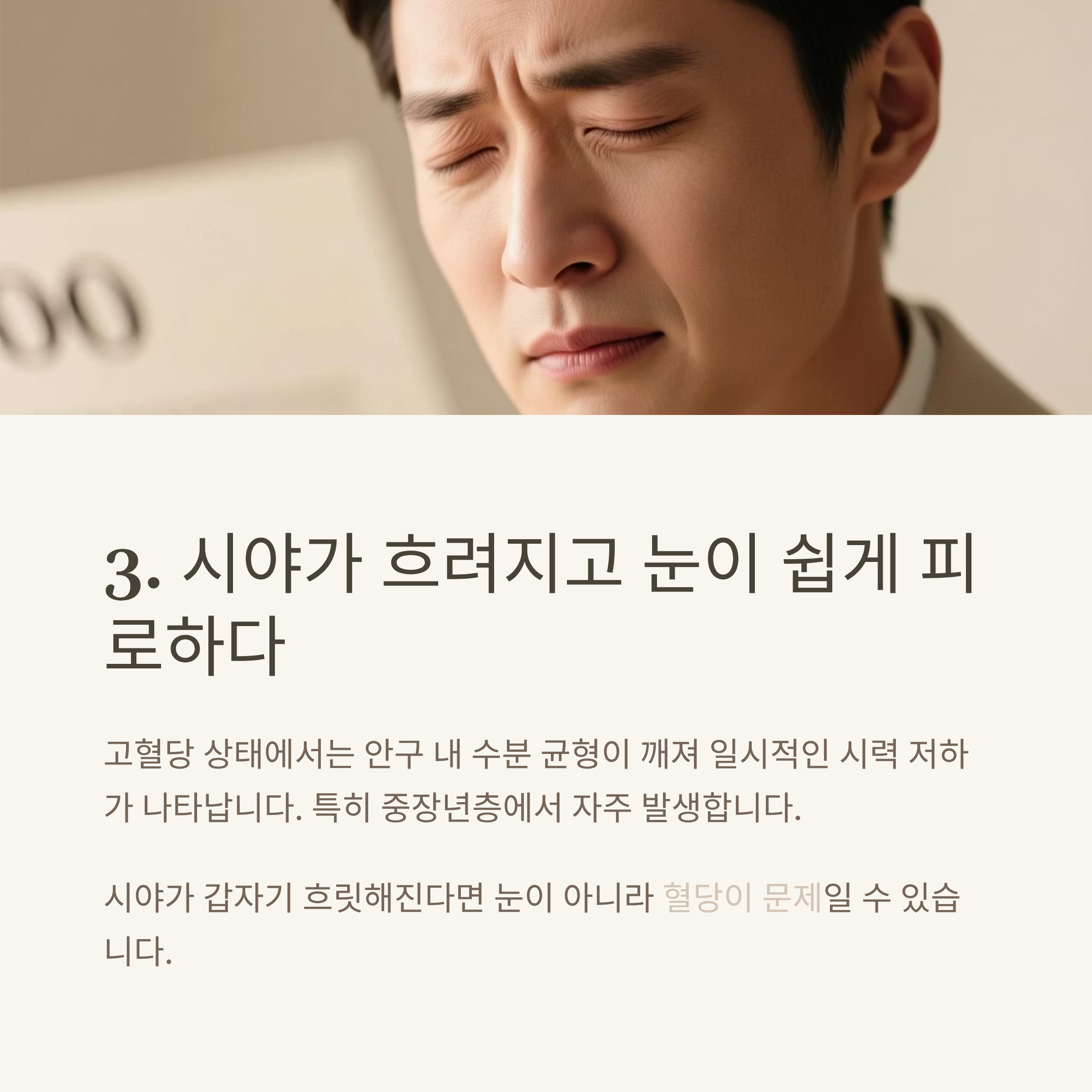시야가 갑자기 흐릿해지거나 초점이 잘 맞지 않는다면 눈이 아니라 혈당이 문제일 수 있습니다.