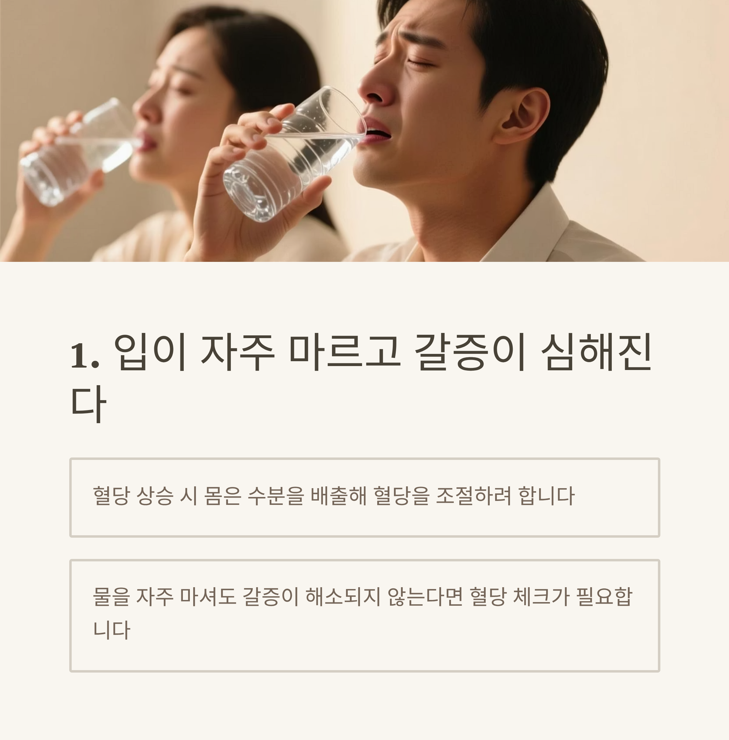 물을 자주 마셔도 갈증이 해소되지 않는 느낌이라면 혈당 체크가 필요합니다.
