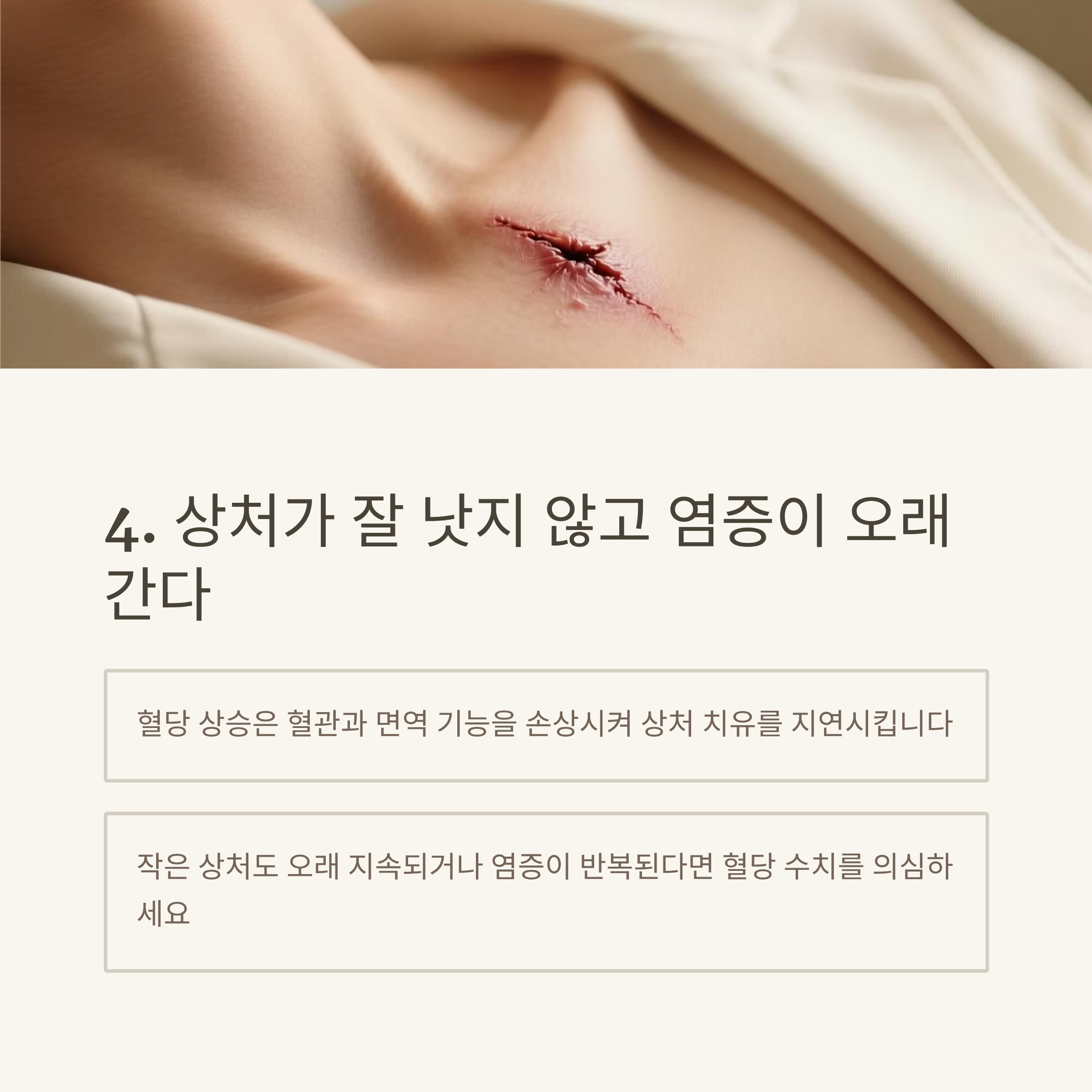 혈당이 높아지면 혈관과 면역 기능이 손상돼 상처 치유가 더뎌집니다.